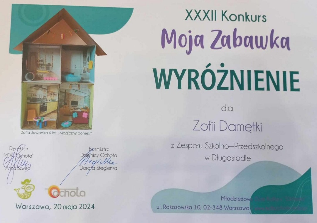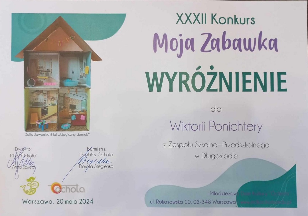 20 maja odbył się XXXII finał konkursu „Moja zabawka”, organizowany przez Młodzieżowy Dom Kultury „Ochota” w Warszawie. Wyróżnienie w konkursie otrzymała Wiktoria Ponichtera z klasy IIIa oraz Zofia Damętka z klasy IIIb.