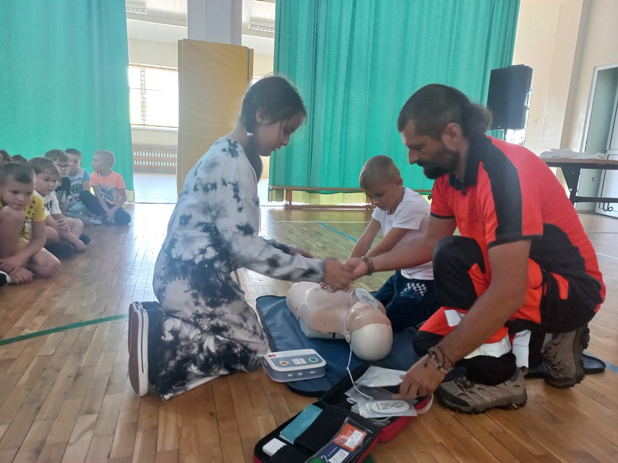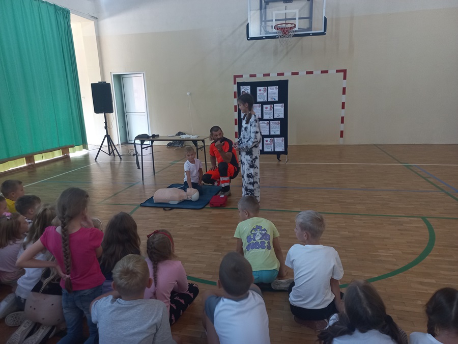 Pan ratownik przypomniał dzieciom numery alarmowe, pokazał jak ułożyć rannego w pozycji bocznej ustalonej. Dzieci dowiedziały się również, jak należy sprawdzać przytomność osoby poszkodowanej oraz w jaki sposób wzywać pomoc i jak rozmawiać przez telefon z dyspozytorem pogotowia ratunkowego.