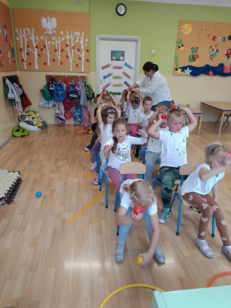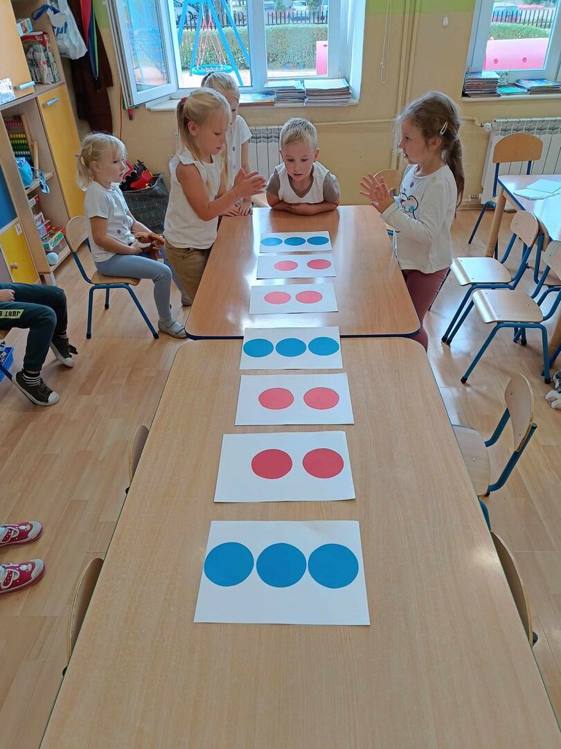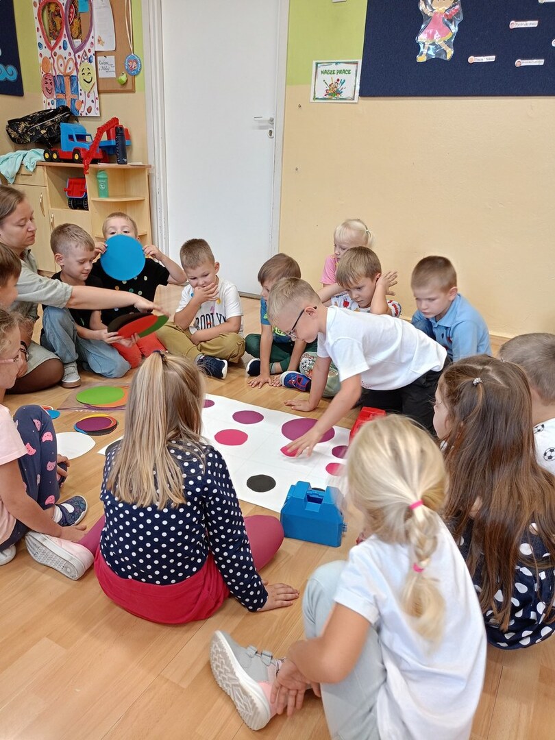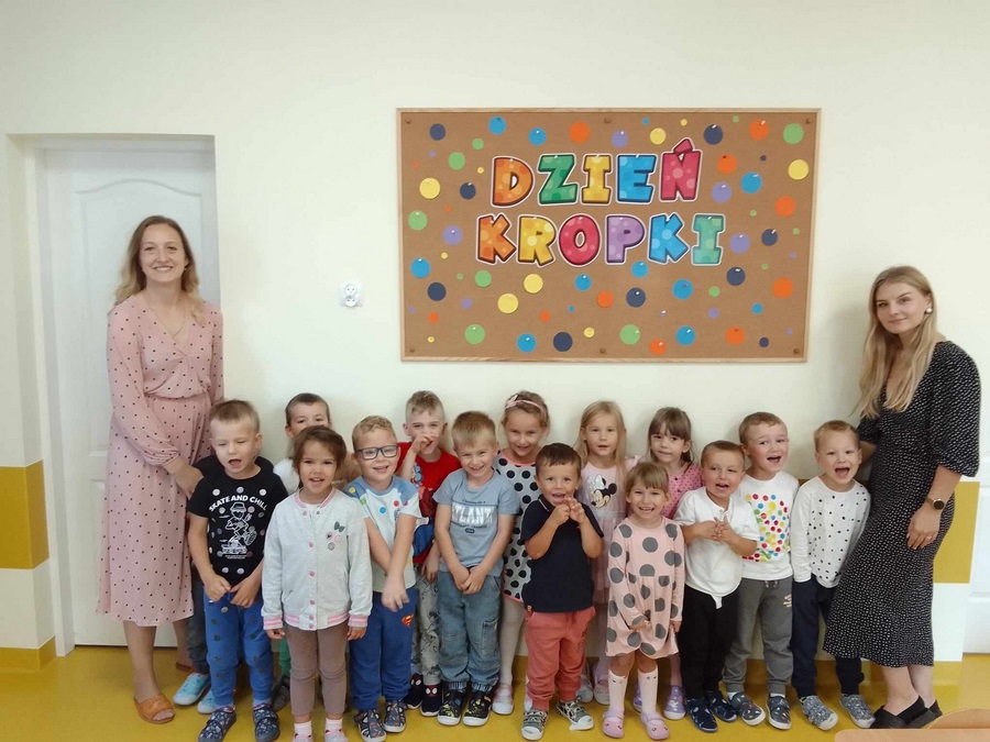 Na zajęciach poznaliśmy genezę tego święta. Dzieci uważnie wysłuchały opowiadania, jak to zwyczajna kropka zmieniła świat małej dziewczynki o imieniu Vashti. Historia ta uświadomiła przedszkolakom, że każdy z nas ma jakieś ukryte zdolności, TALENTY. Kropki gościły zarówno w zabawach ruchowych jak i matematycznych.