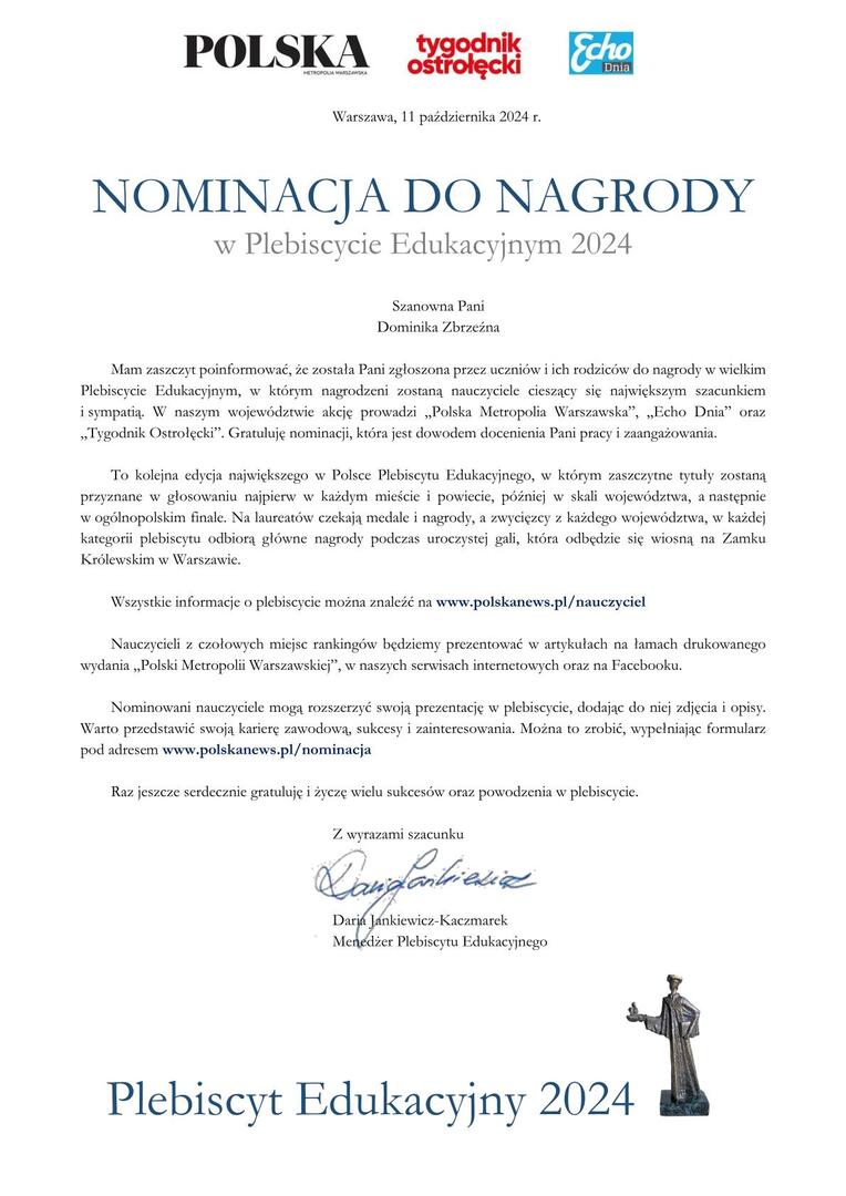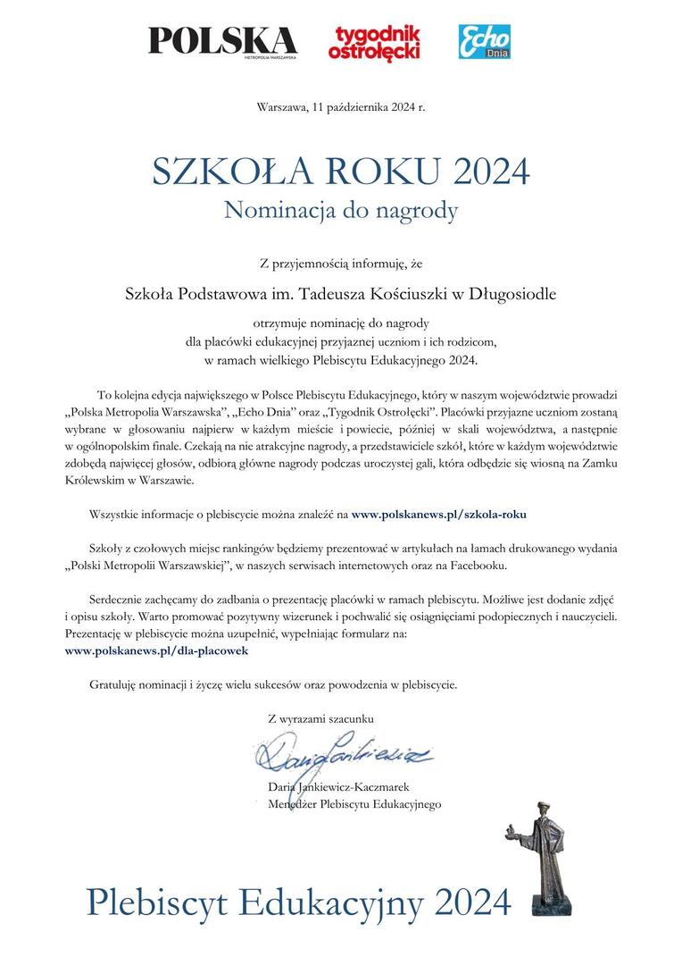Jest nam bardzo miło, że nasza szkoła została nominowana do nagrody "Szkoła Roku 2024".