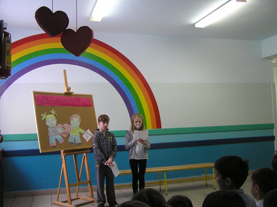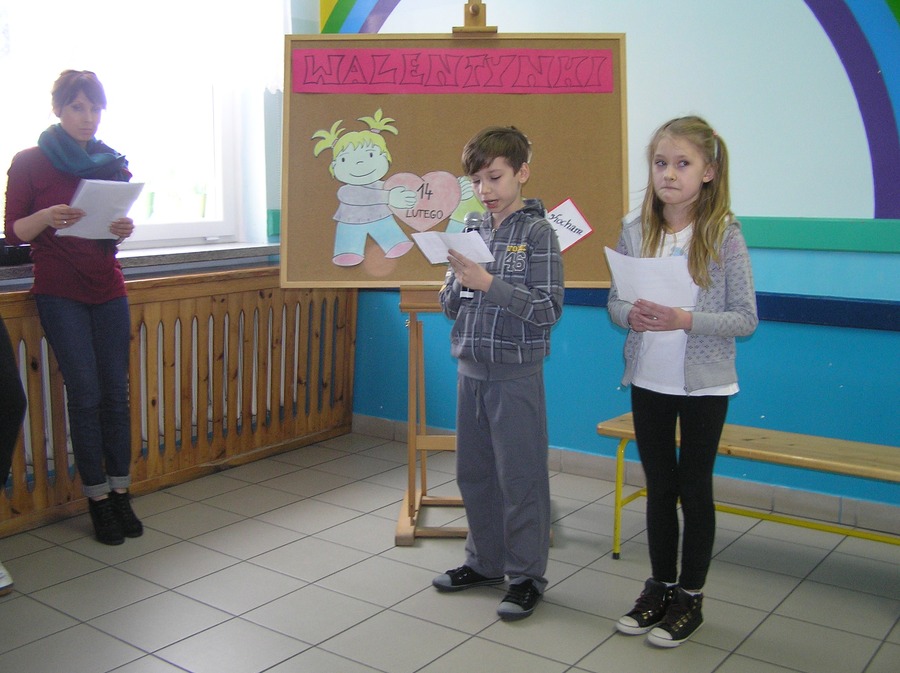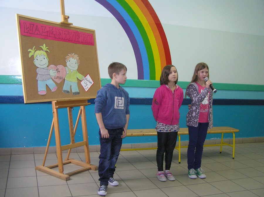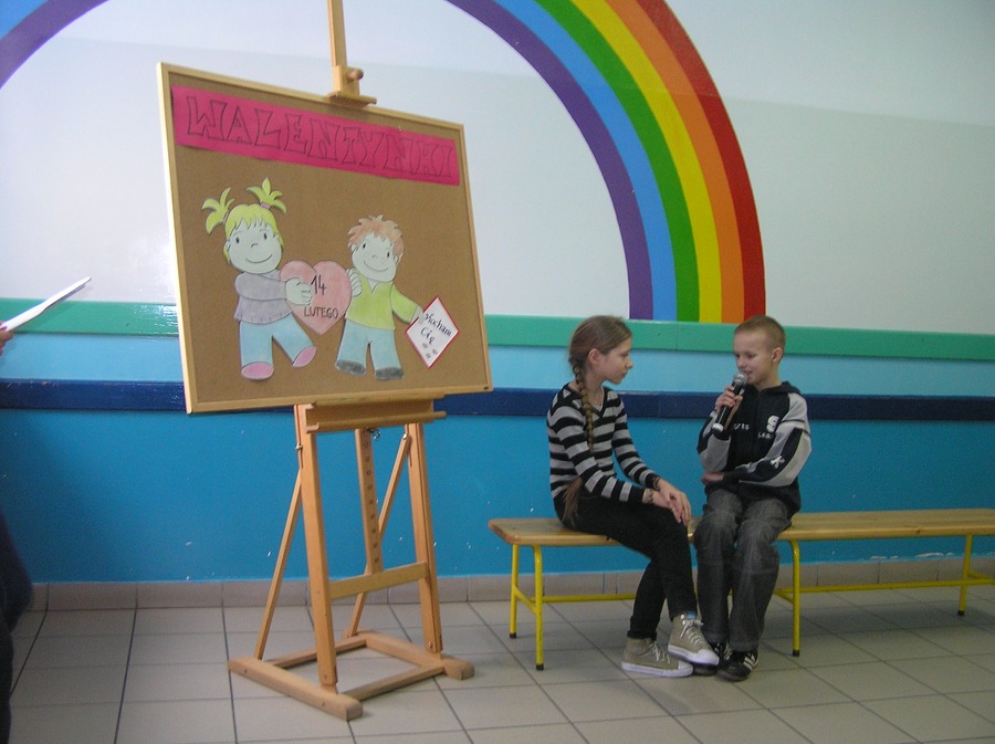 Uczniowie klasy IVa pod kierunkiem p. Marleny Dyl przygotowali krótki występ przypominający pochodzenie tego święta. Usłyszeliśmy wiersze o tematyce miłosnej i kilka walentynkowych porad. Podczas apelu pani dyrektor pogratulowała najlepszym uczniom wyników w nauce za pierwszy okres oraz uczniom, którzy odnieśli sukcesy w konkursach. Następnie walentynkowa poczta została rozdana przez szkolnego listonosza, którym był Mateusz Kot z VIa.