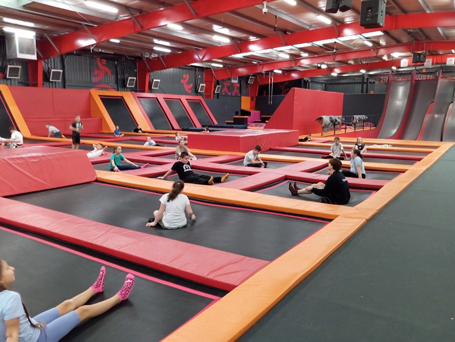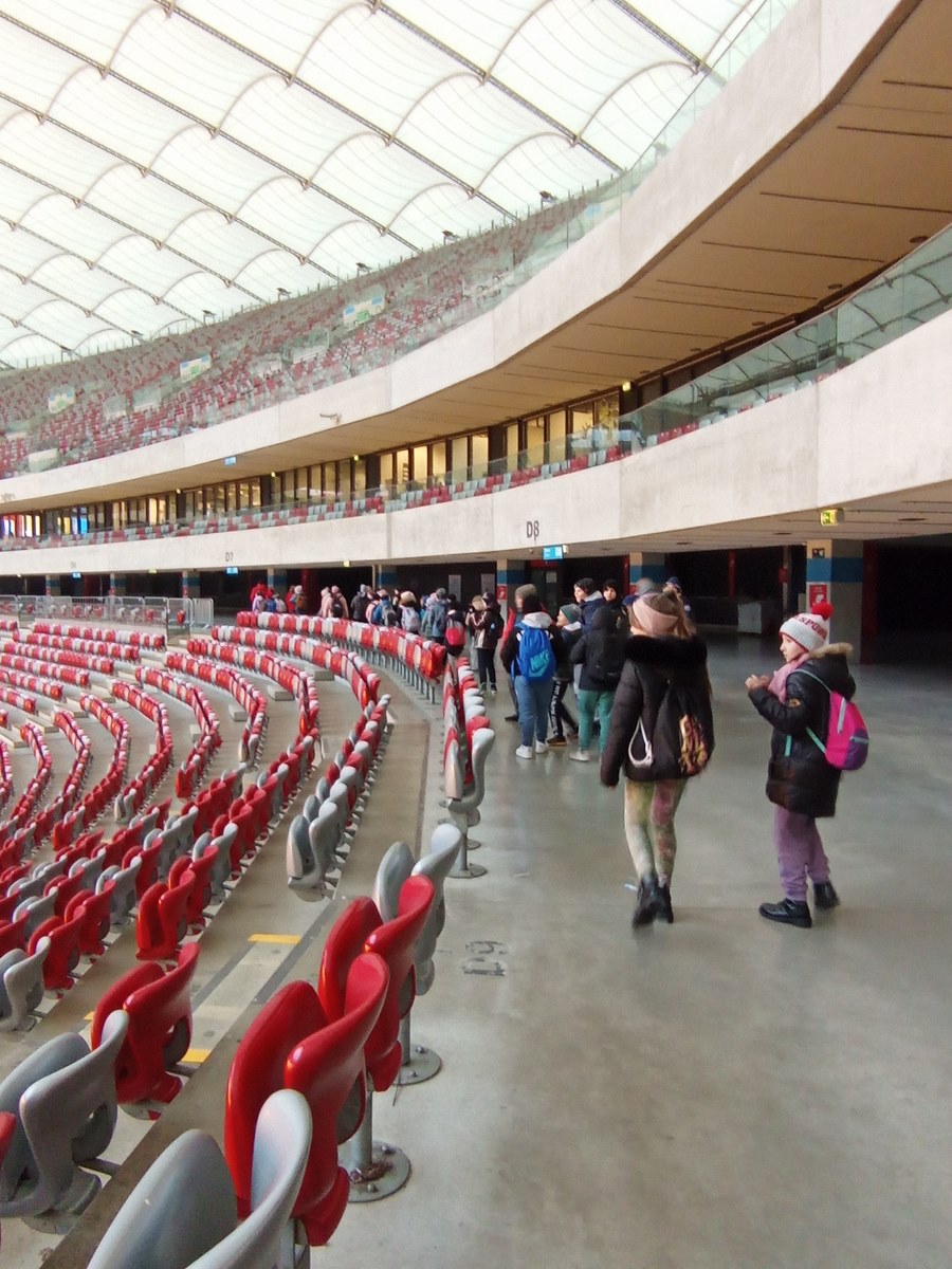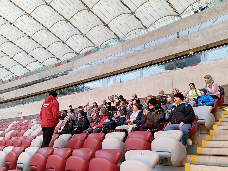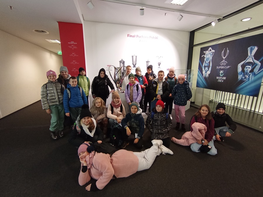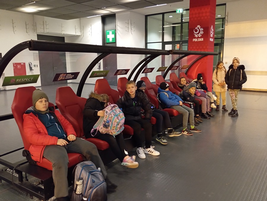 Pierwsza była oczywiście rozgrzewka. Następnie uczniowie próbowaliśmy swoich umiejętności w skokach na trampolinach, w grze w zbijaka na trampolinach, skokach przez przeszkody z odbicia, wrzucaniu piłki do kosza po odbiciu z trampoliny. Trenowali także ewolucje lądując bezpiecznie na poduszce powietrznej. Kolejnym punktem było zwiedzanie Stadionu Narodowego PGE trasą „Piłkarskie emocje”. Uczniowie zostali zapoznani z historią i ciekawostkami Stadionu, zwiedzili pomieszczenia strefy zawodniczej wykorzystywane podczas meczów reprezentacji Polski w piłce nożnej, centrum medialne PGE Narodowego, które przeznaczone jest dla dziennikarzy, zasiedli na lożach VIP na trybunach oraz weszli na murawę. Był to bardzo aktywny dzień, ale pomimo zmęczenia wszyscy wrócili zadowoleni.