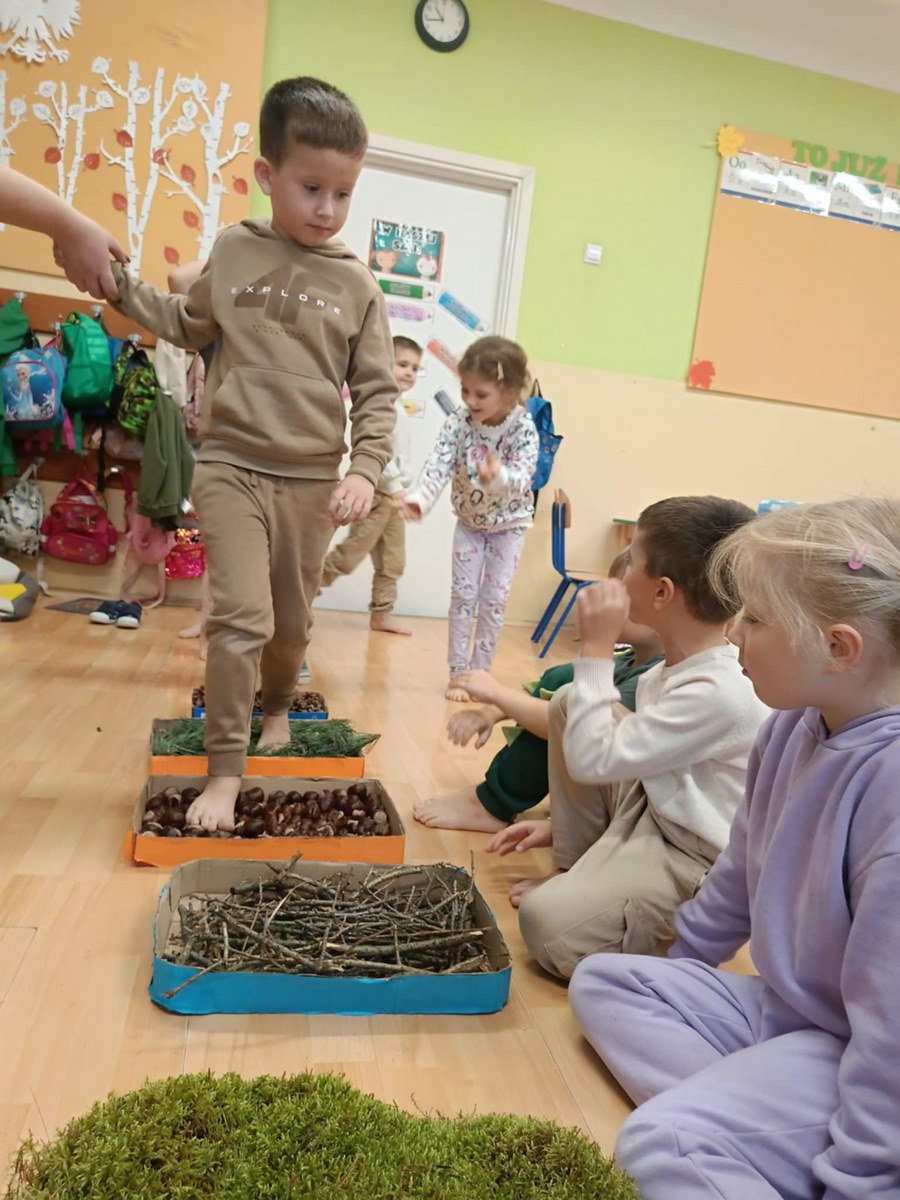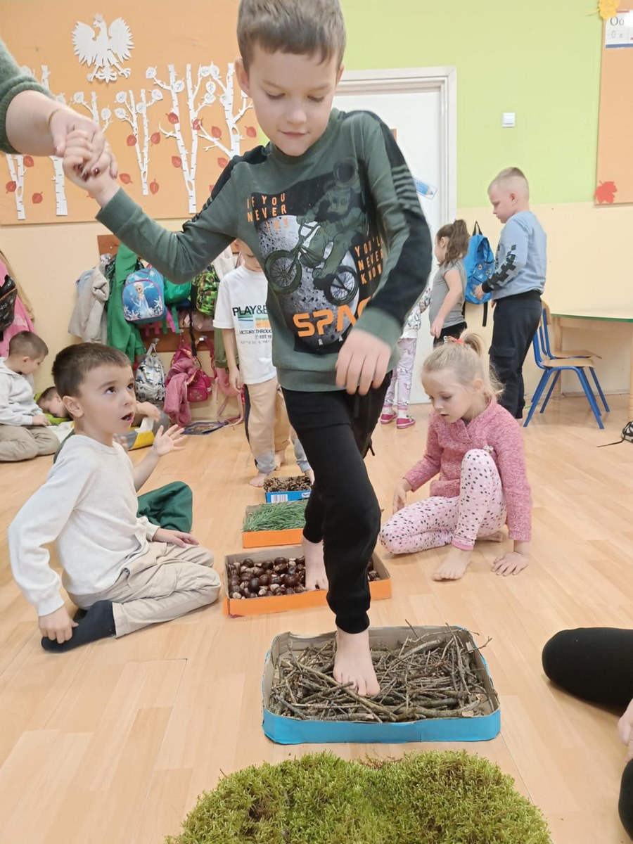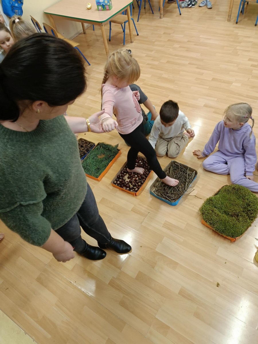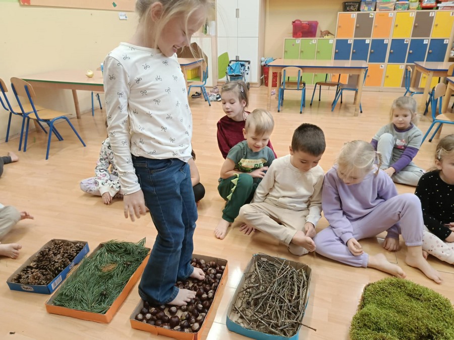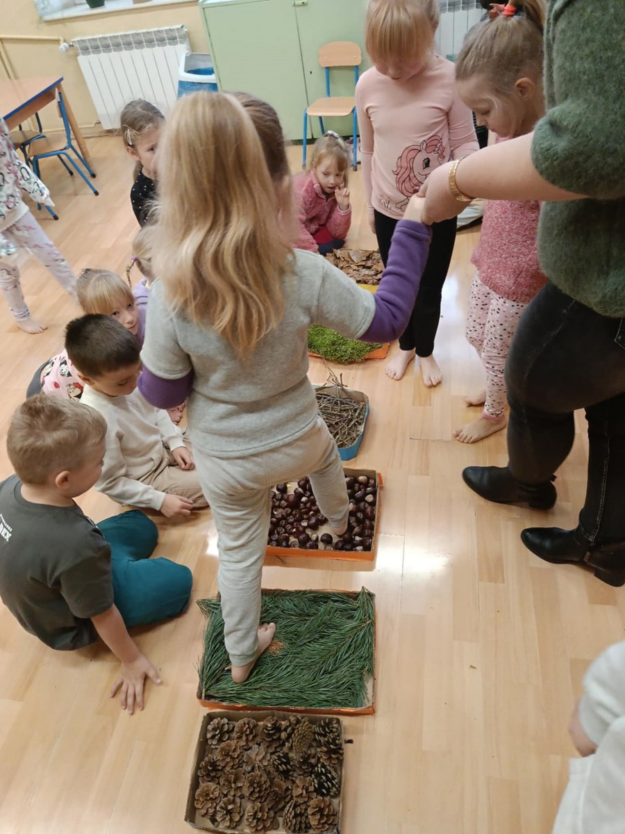 Misie postanowiły wykorzystać dary Pani Jesieni i stworzyć jesienną ścieżkę sensoryczną, utworzoną z liści, igieł sosny, kasztanów, patyków, mchu i szyszek. Chodzenie po niej nie było łatwe. Taka ścieżka sensoryczna ma bardzo duże znaczenie dla dziecięcych stópek – usprawnia motorykę dużą, rozwija wrażenia dotykowe, poprawia równowagę i koordynację ruchową ale przede wszystkim stymuluje receptory. Ścieżka sensoryczna pozwala rozwijać wyobraźnię dotykową, która jest niezbędna do prawidłowego poznawania świata przez dziecko. Spacer po wyznaczonej trasie sprawił przedszkolakom mnóstwo radości i satysfakcji. Z pewnością kiedyś ją powtórzymy.