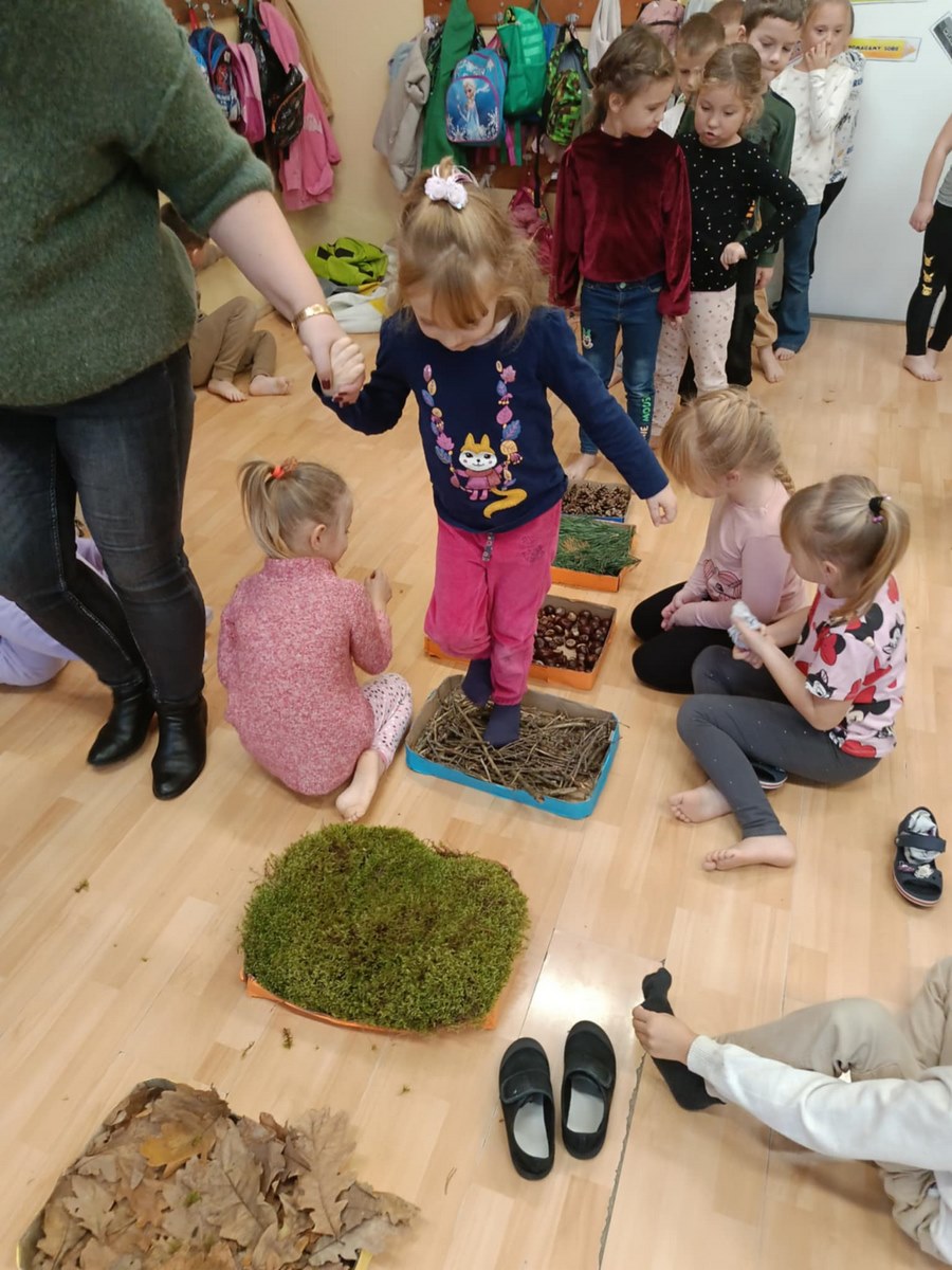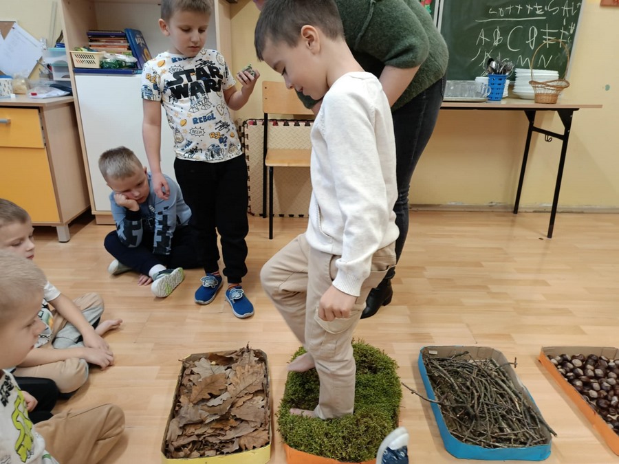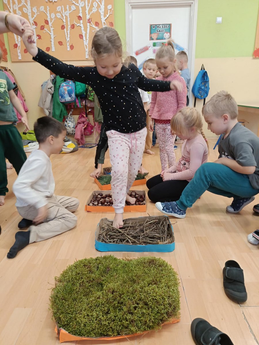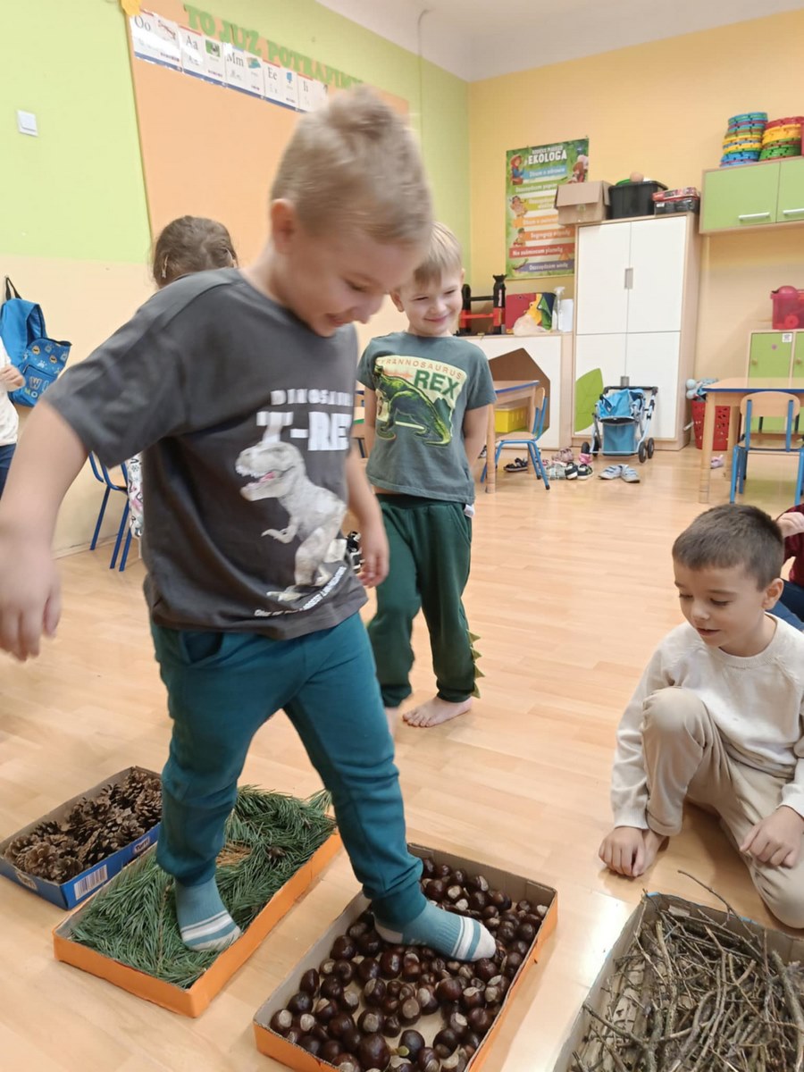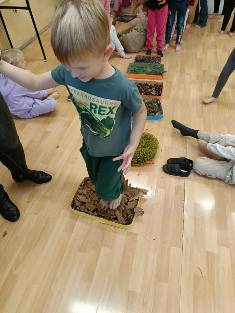 Misie postanowiły wykorzystać dary Pani Jesieni i stworzyć jesienną ścieżkę sensoryczną, utworzoną z liści, igieł sosny, kasztanów, patyków, mchu i szyszek. Chodzenie po niej nie było łatwe. Taka ścieżka sensoryczna ma bardzo duże znaczenie dla dziecięcych stópek – usprawnia motorykę dużą, rozwija wrażenia dotykowe, poprawia równowagę i koordynację ruchową ale przede wszystkim stymuluje receptory. Ścieżka sensoryczna pozwala rozwijać wyobraźnię dotykową, która jest niezbędna do prawidłowego poznawania świata przez dziecko. Spacer po wyznaczonej trasie sprawił przedszkolakom mnóstwo radości i satysfakcji. Z pewnością kiedyś ją powtórzymy.