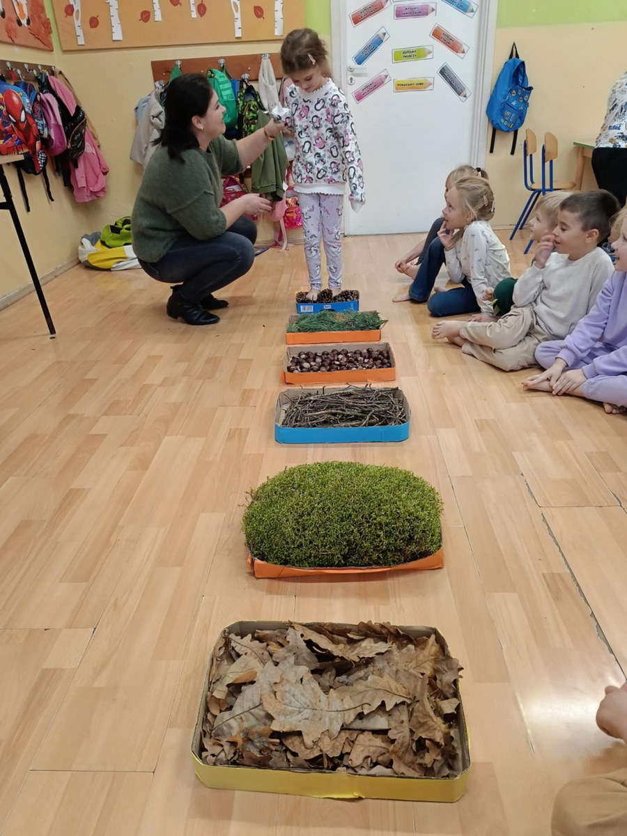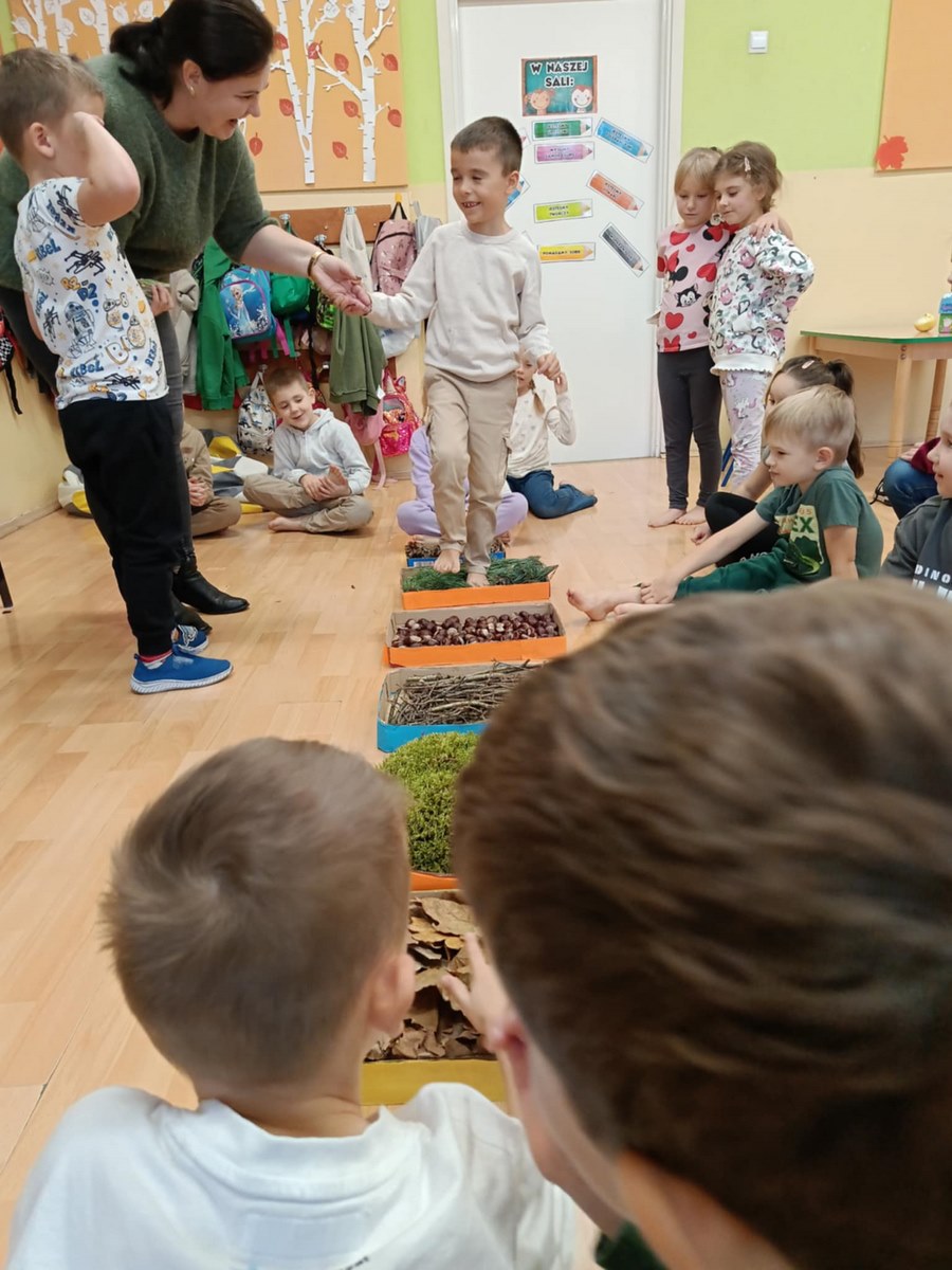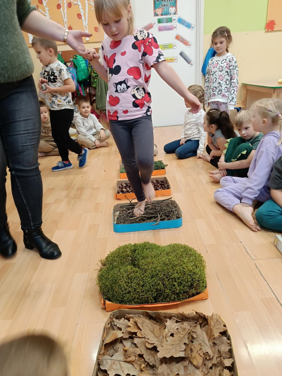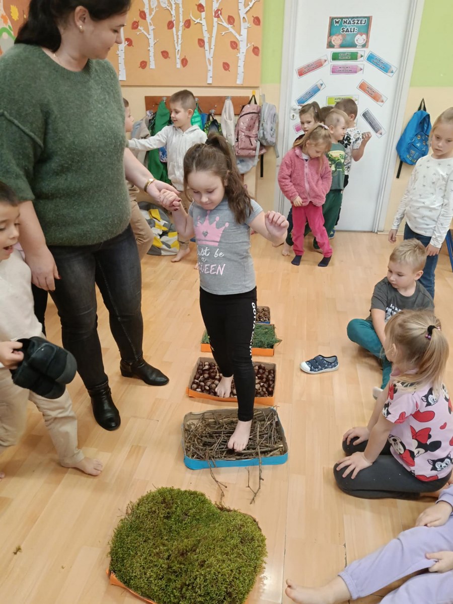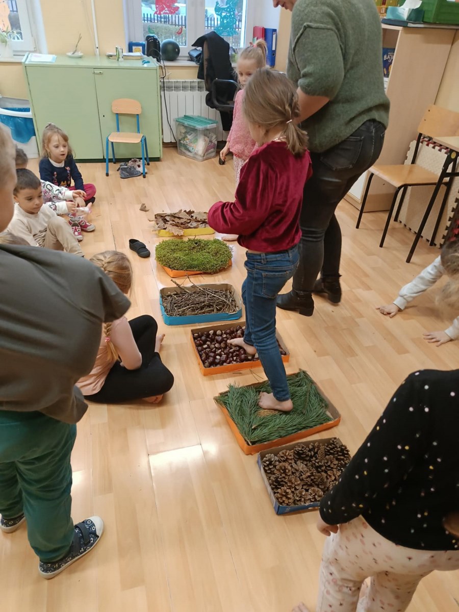 Misie postanowiły wykorzystać dary Pani Jesieni i stworzyć jesienną ścieżkę sensoryczną, utworzoną z liści, igieł sosny, kasztanów, patyków, mchu i szyszek. Chodzenie po niej nie było łatwe. Taka ścieżka sensoryczna ma bardzo duże znaczenie dla dziecięcych stópek – usprawnia motorykę dużą, rozwija wrażenia dotykowe, poprawia równowagę i koordynację ruchową ale przede wszystkim stymuluje receptory. Ścieżka sensoryczna pozwala rozwijać wyobraźnię dotykową, która jest niezbędna do prawidłowego poznawania świata przez dziecko. Spacer po wyznaczonej trasie sprawił przedszkolakom mnóstwo radości i satysfakcji. Z pewnością kiedyś ją powtórzymy.