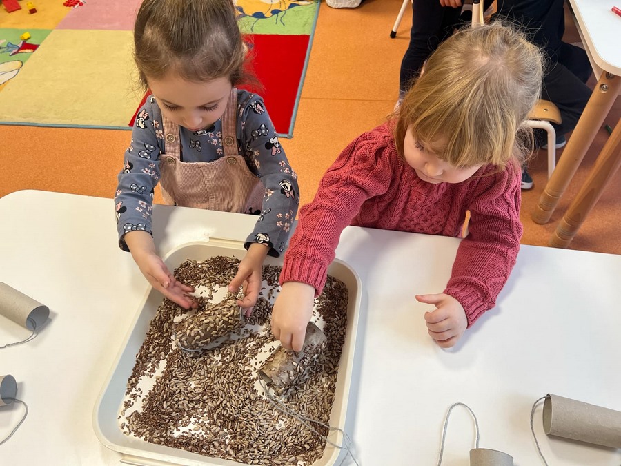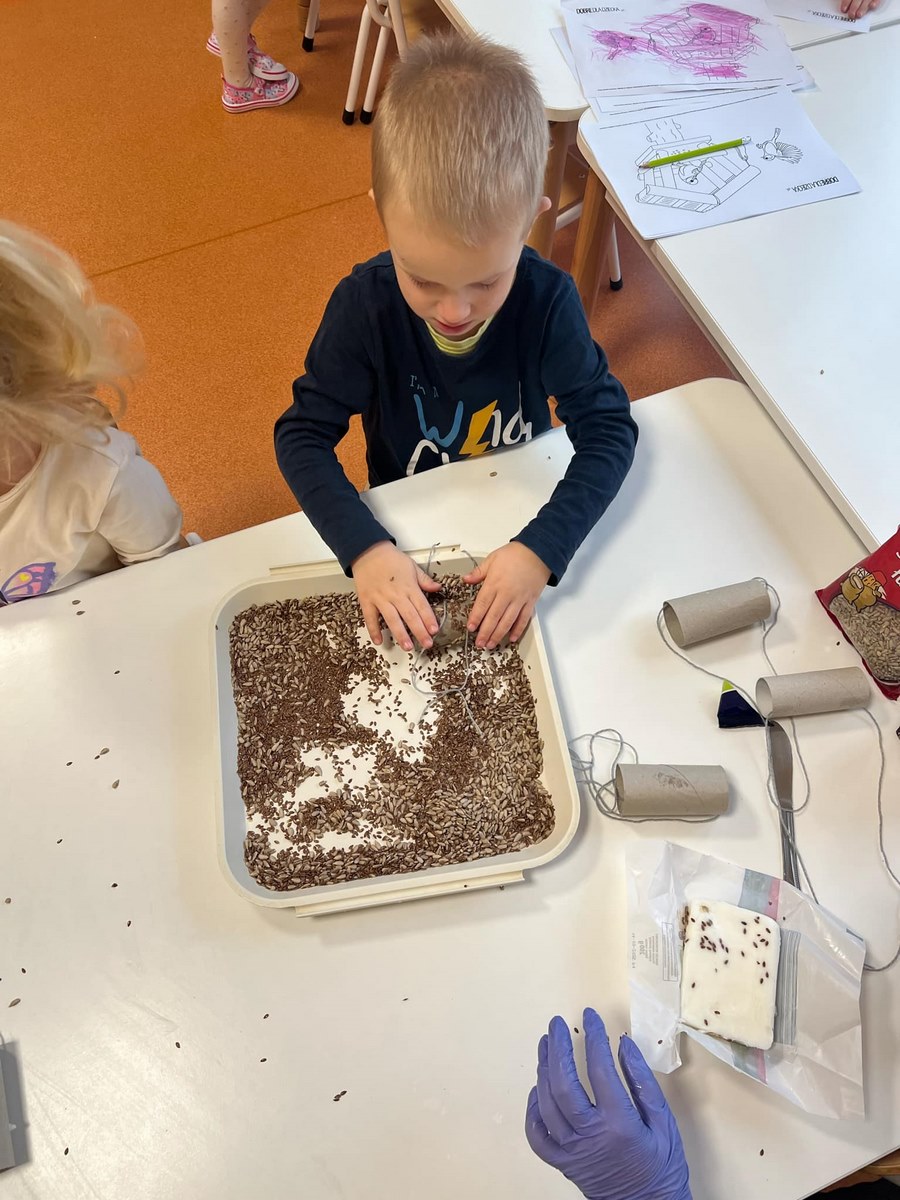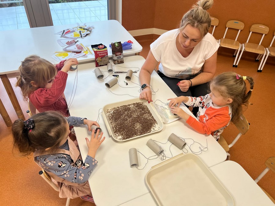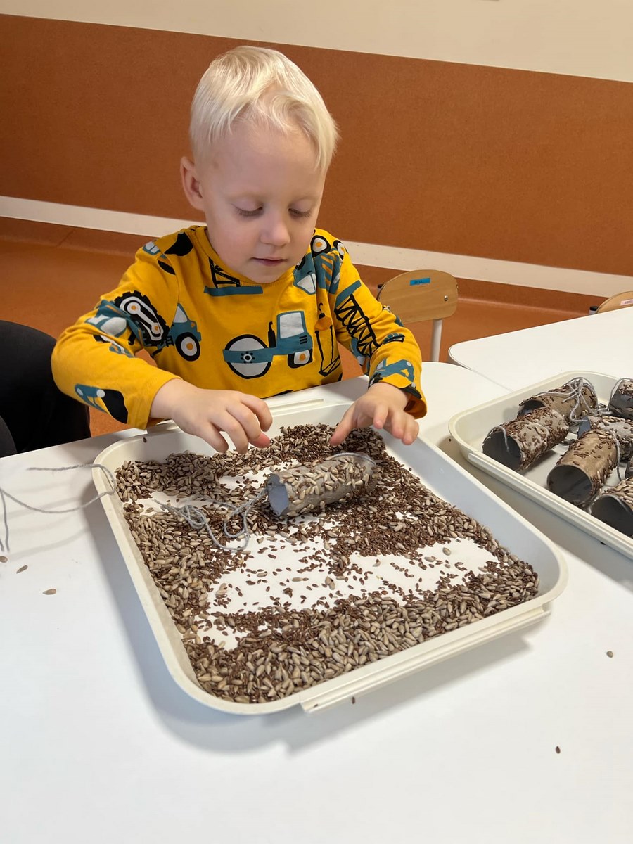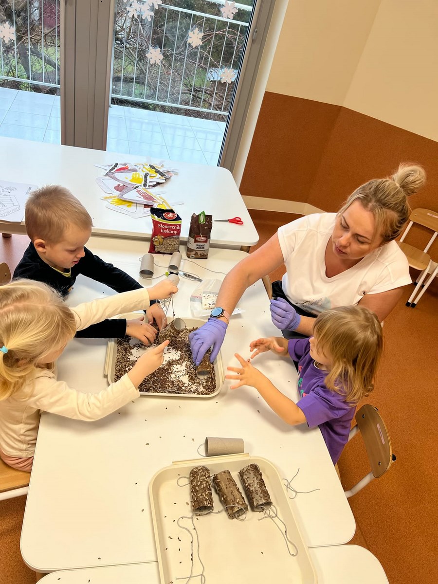 Podczas zajęć dzieci z grupy Jeżyki przygotowały jedzonko dla ptaszków. Rozmawiały o tym jak ważne jest dokarmianie zwierząt zimą , oraz czym można je żywić. Przygotowały ziarenka i obtaczały je w smalcu, słoneczniku oraz siemieniu lnianym. Mamy nadzieję, że ptaki będą często zaglądały do naszej stołówki.