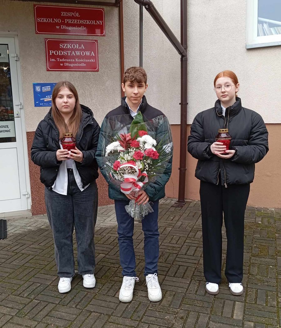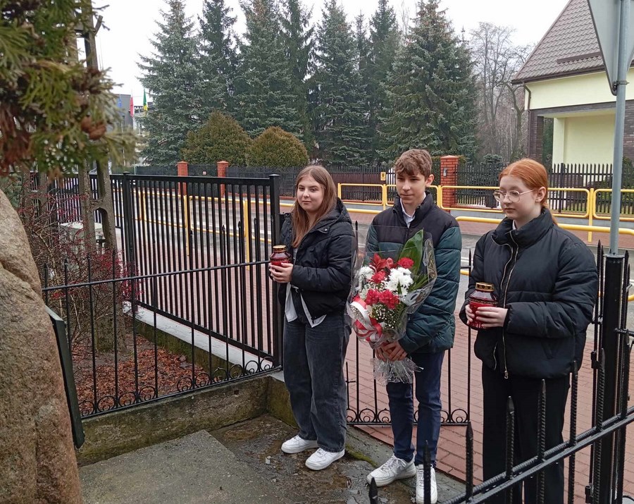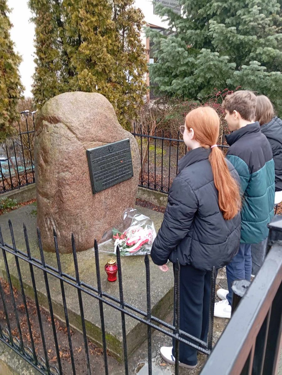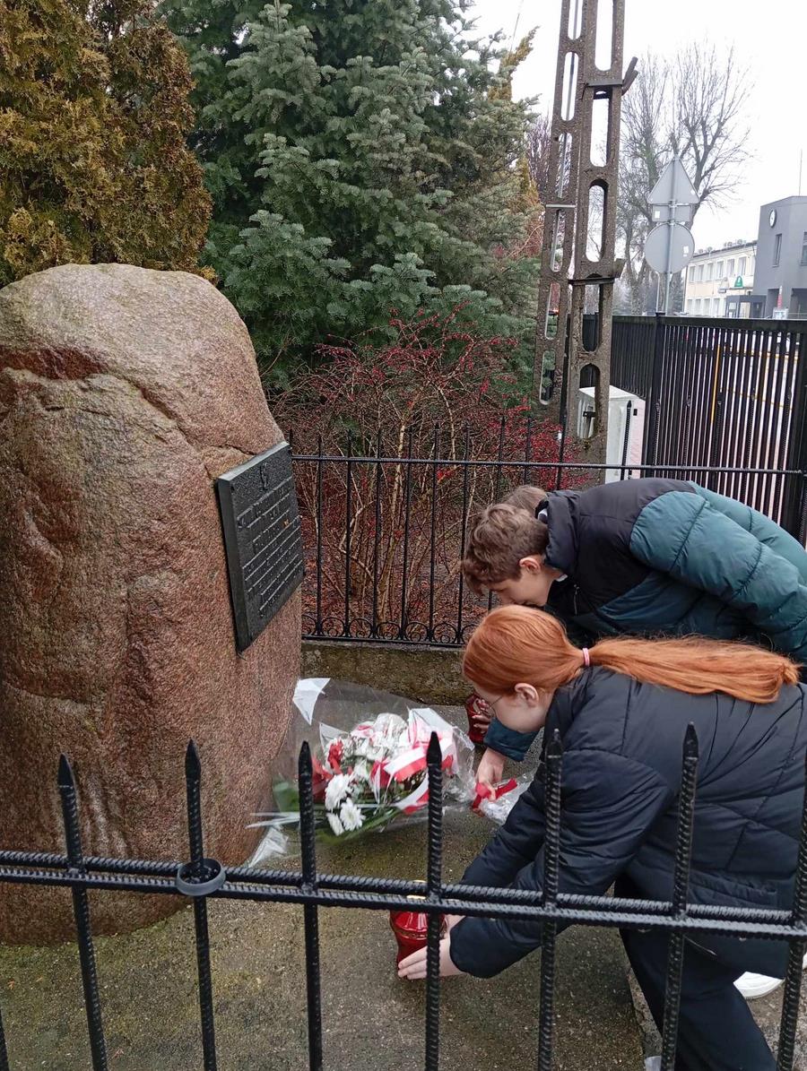 Przedstawiciele społeczności szkolnej złożyli też kwiaty pod kamieniem upamiętniającym ofiary z lutego 1944 r.