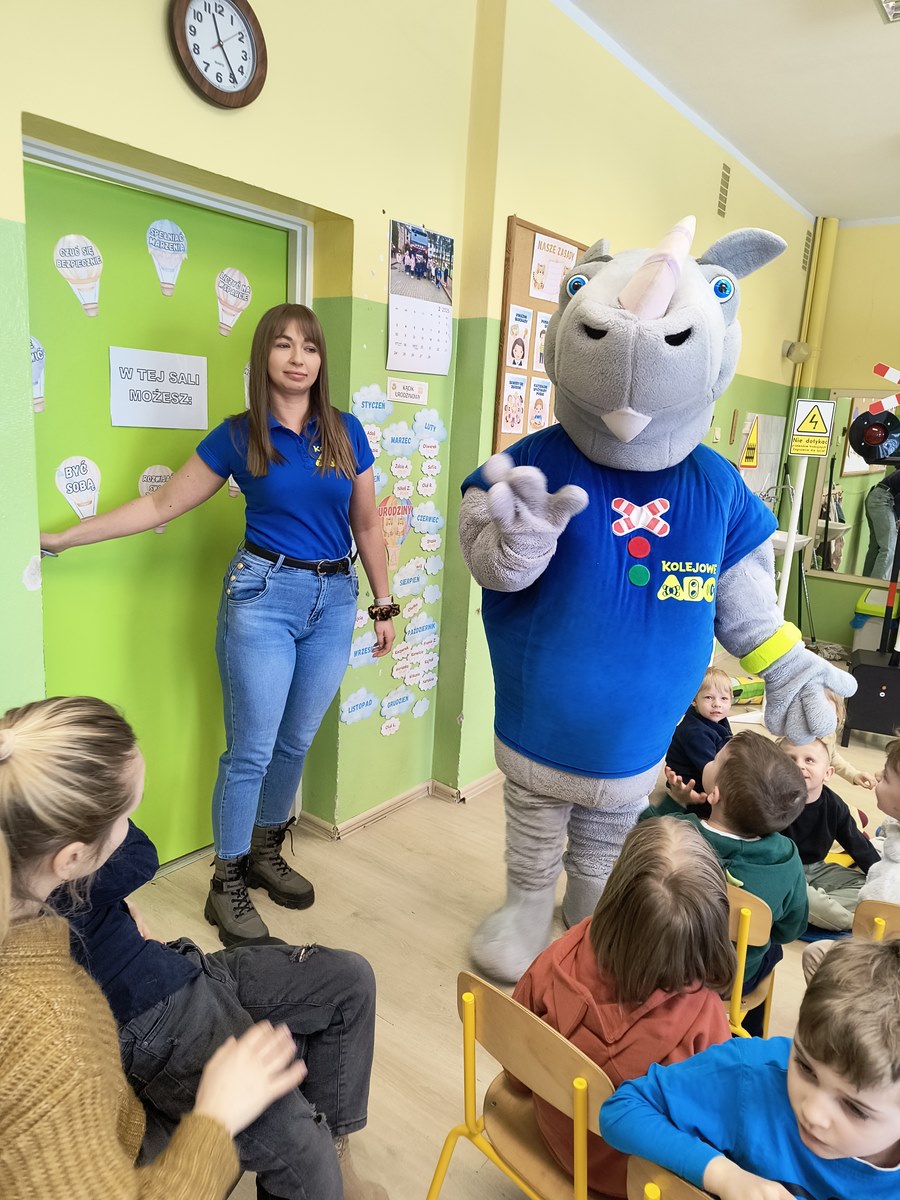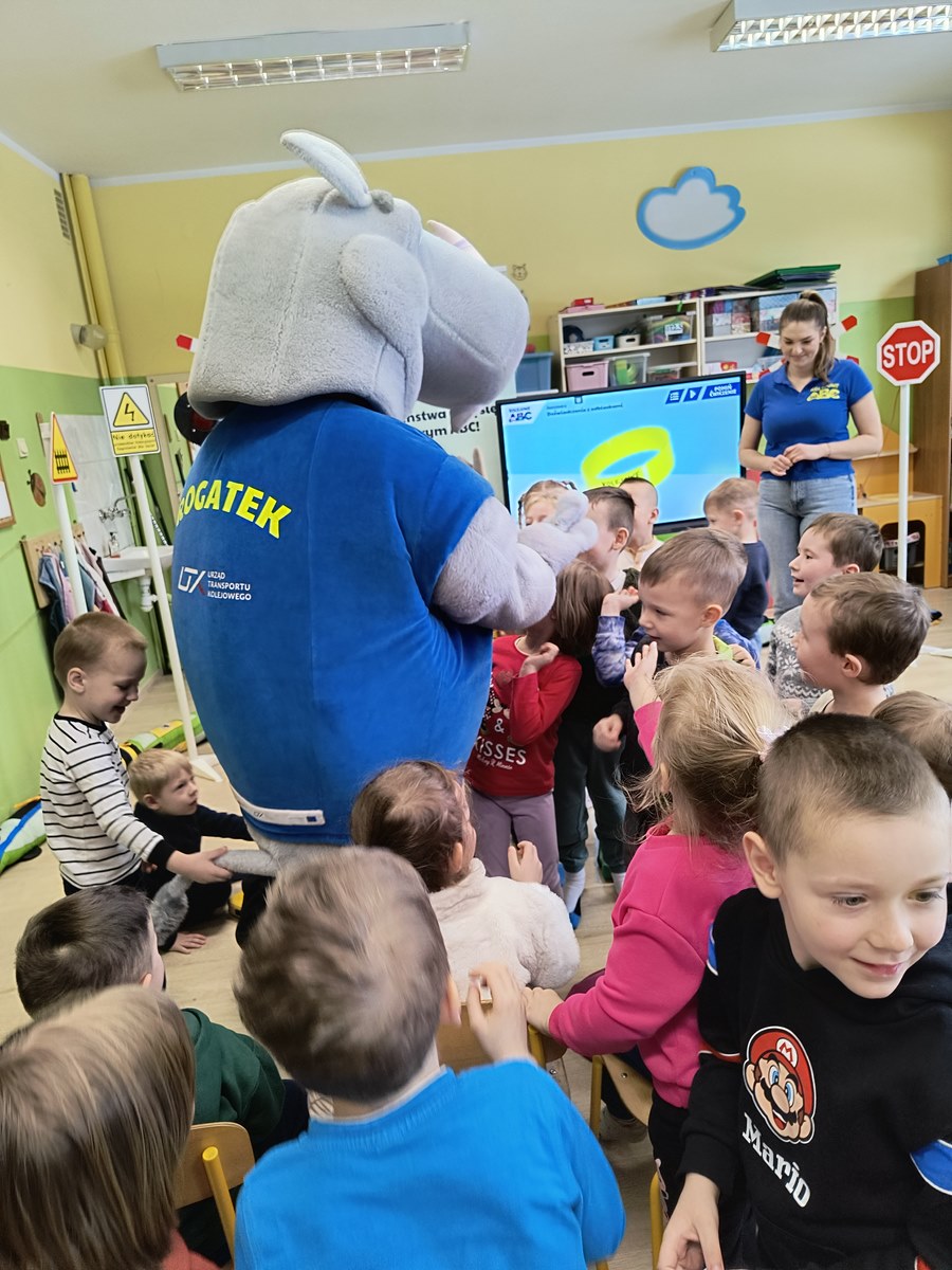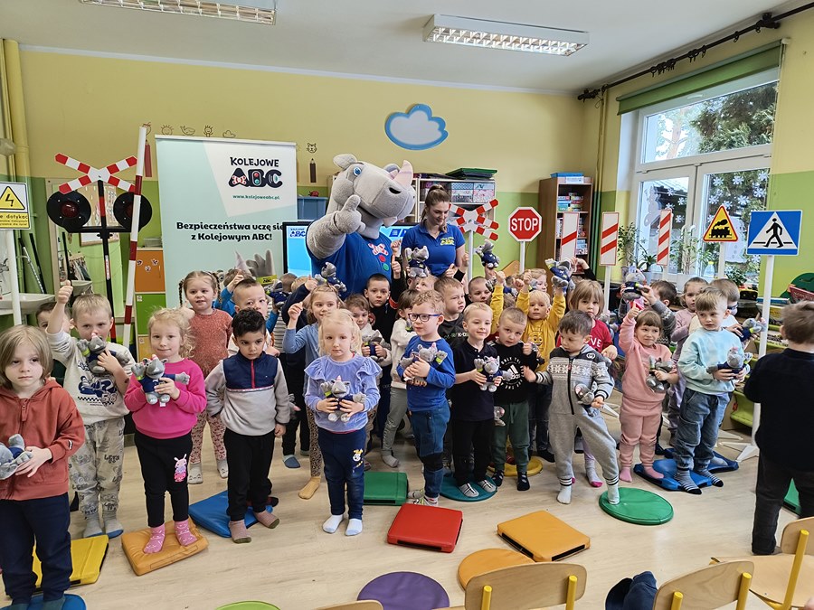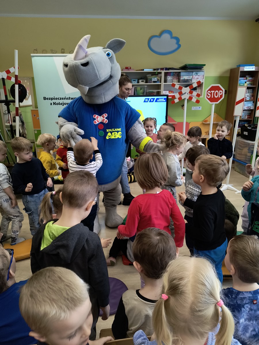 19 lutego dzieci z grup „Motylki” i „Pszczółki” uczestniczyły w zajęciach realizowanych przez Urząd Transportu Kolejowego w Warszawie, w ramach projektu "Kampania Kolejowe ABC" dotyczących edukacji w zakresie bezpieczeństwa kolejowego. Podczas warsztatów przedszkolaki poznały specyfikę działania zapór z sygnalizacją świetlną, znaki drogowe, które można spotkać przed przejazdami kolejowo-drogowymi. Dowiedziały się, co oznaczają piktogramy umieszczane na dworcach i w pociągach. Poznały prawidłowe zachowania w pobliżu torów, w pociągu i na peronie oraz na przejeździe kolejowym. Dzieci z zaciekawieniem i bardzo aktywnie brały udział w prezentacji multimedialnej, odpowiadały na zadawane pytania i rozwiązywały zagadki związane ze znakami kolejowymi. Na zakończenie dzieci otrzymały prezenty – maskotki nosorożca Rogatka. Dziękujemy Edukatorom z Urzędu Transportu Kolejowego za bardzo ciekawe zajęcia.