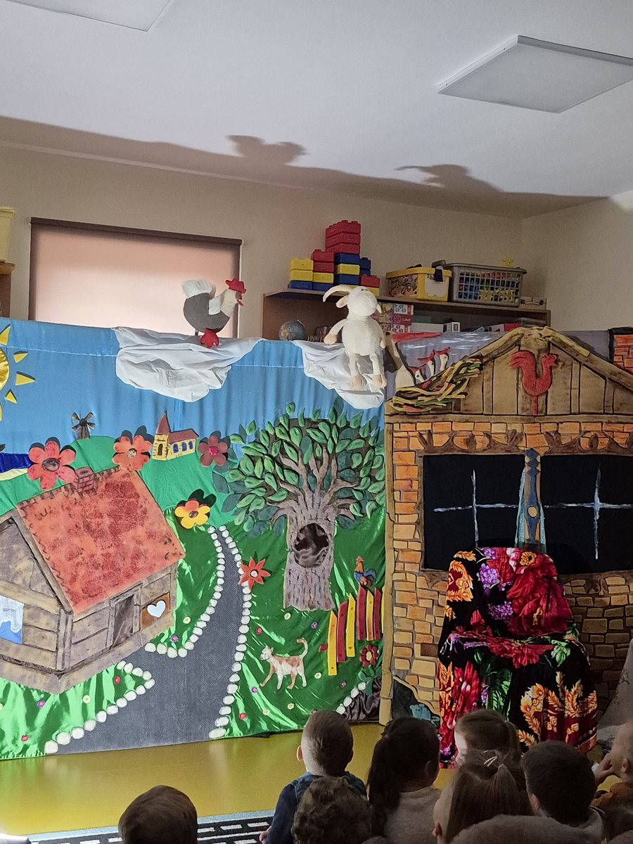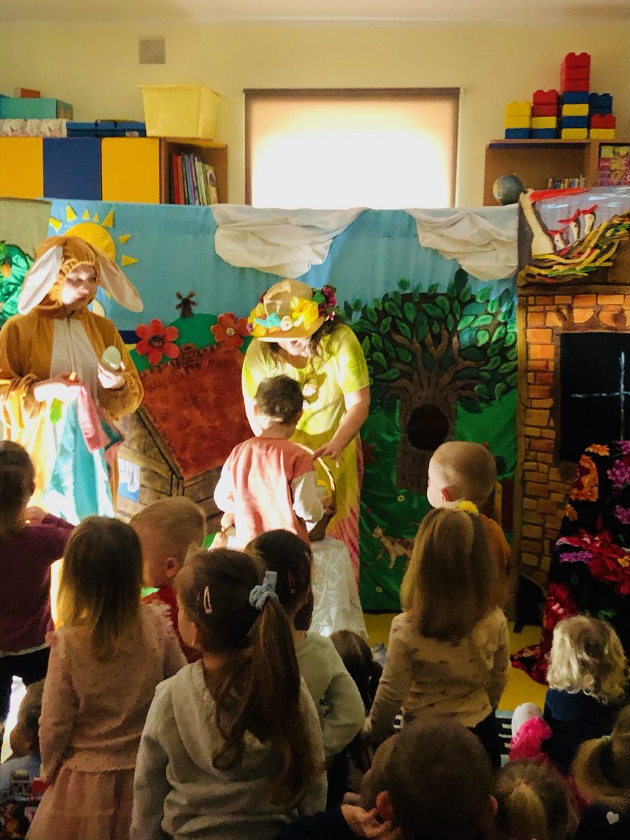 31 marca nasze przedszkole odwiedziło Studio Artystyczne PASJA. Aktorzy zaprezentowali dzieciom radosny spektakl o świątecznej tematyce pt. „Gdzie się podziały jajka?”. W spektaklu Zając Artysta zajmujący się malowaniem pisanek, przywłaszczył sobie koszyk jaj. Pościg za złodziejem prowadziła Kura z pomocą Baranka. Narratorką była Pani Wiosna, która w pełen humoru sposób opowiadała ich historię oraz przypomniała dzieciom o wielkanocnych zwyczajach.