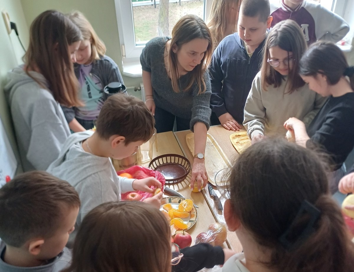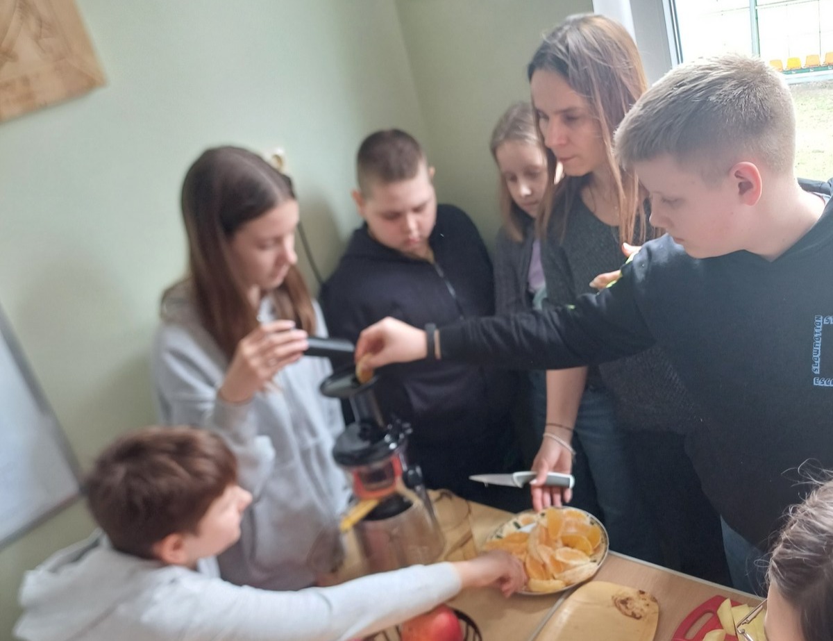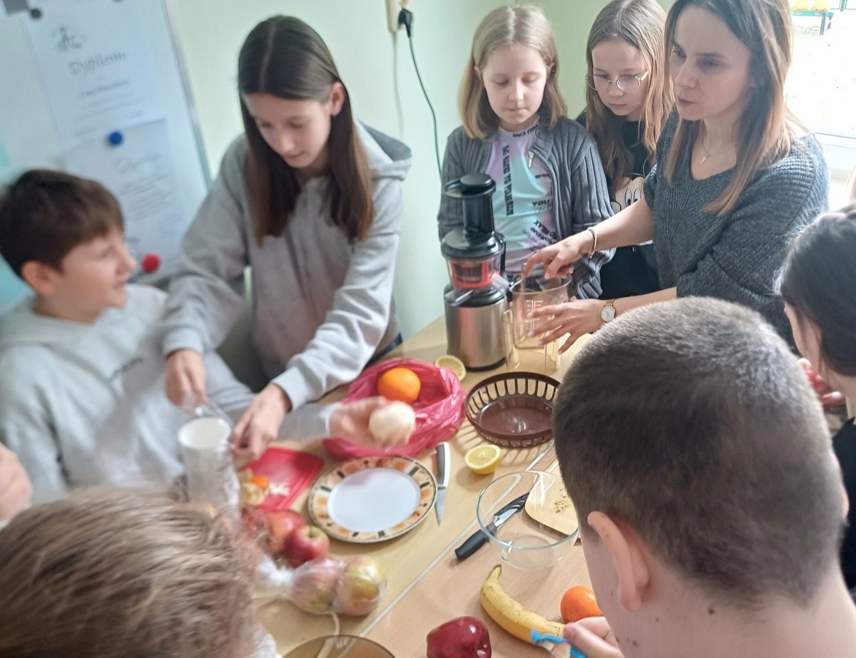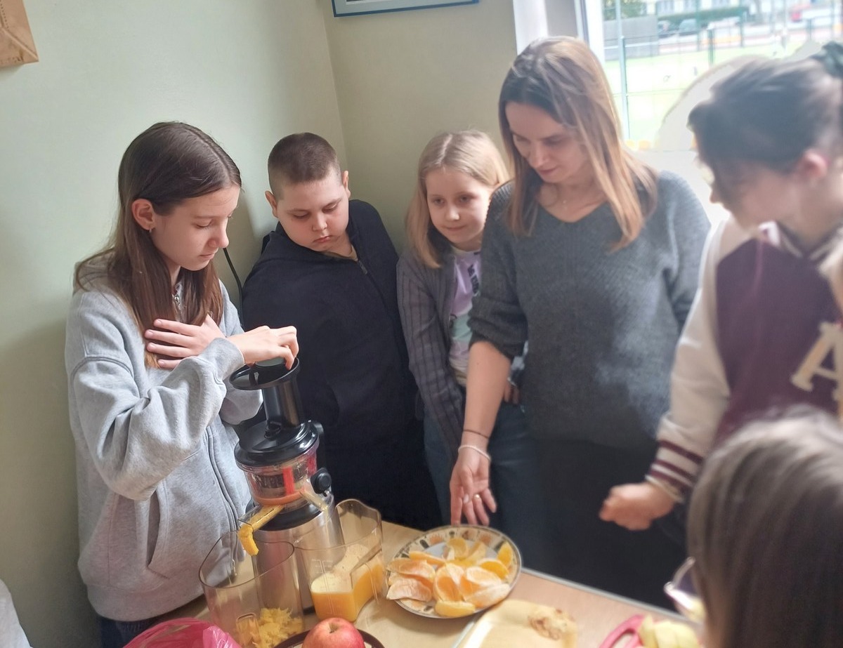 Klasa IVb na lekcji języka polskiego poznała nową formę wypowiedzi pisemnej, a jednocześnie użytkowej, jaką jest przepis kulinarny. Aby teoria szła w parze z praktyką, uczniowie własnoręcznie wykonali pyszny sok pomarańczowo-jabłkowy, wykorzystując do tego wyciskarkę wolnoobrotową.