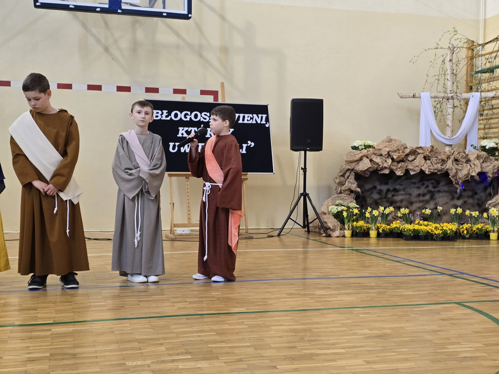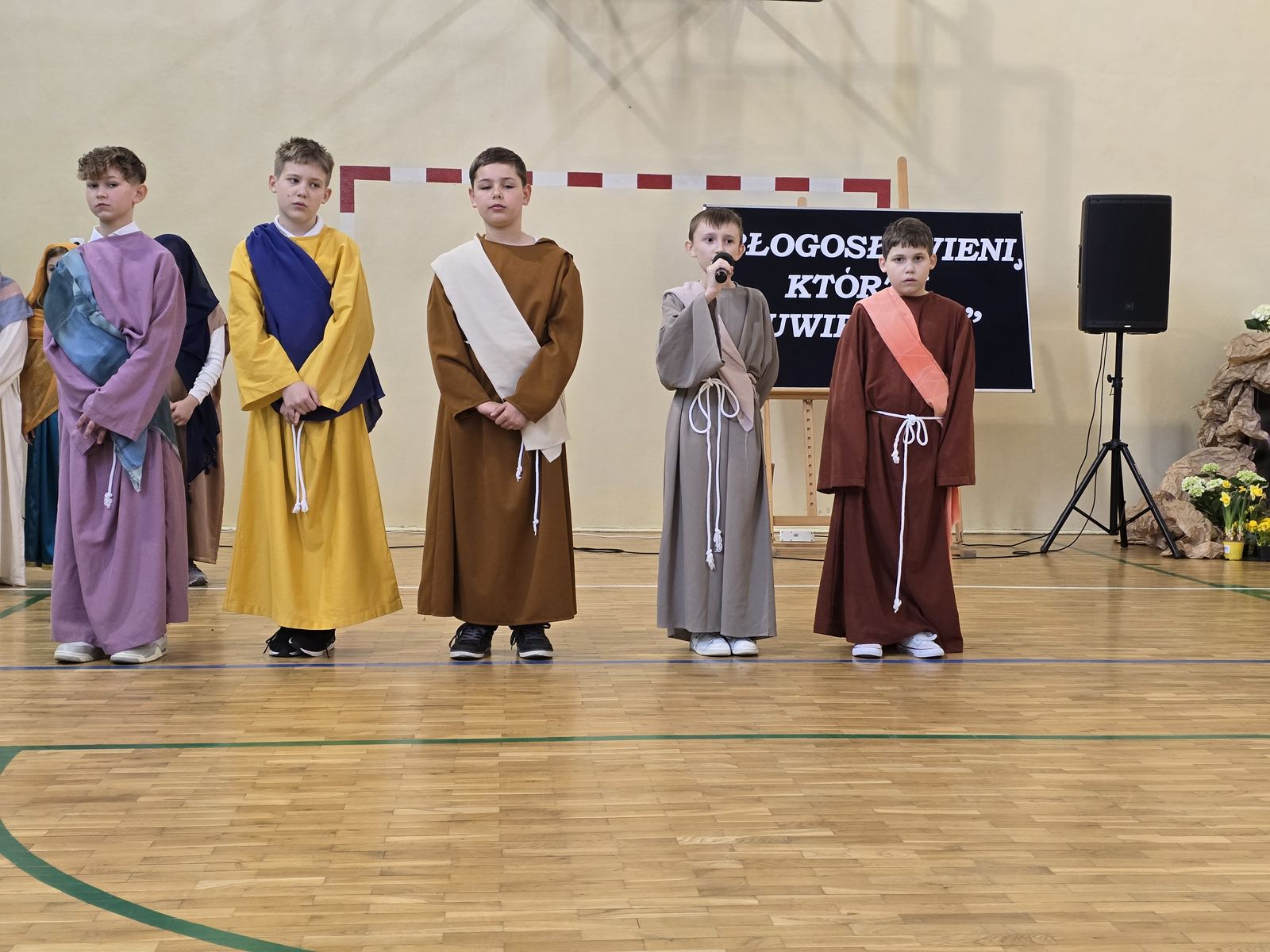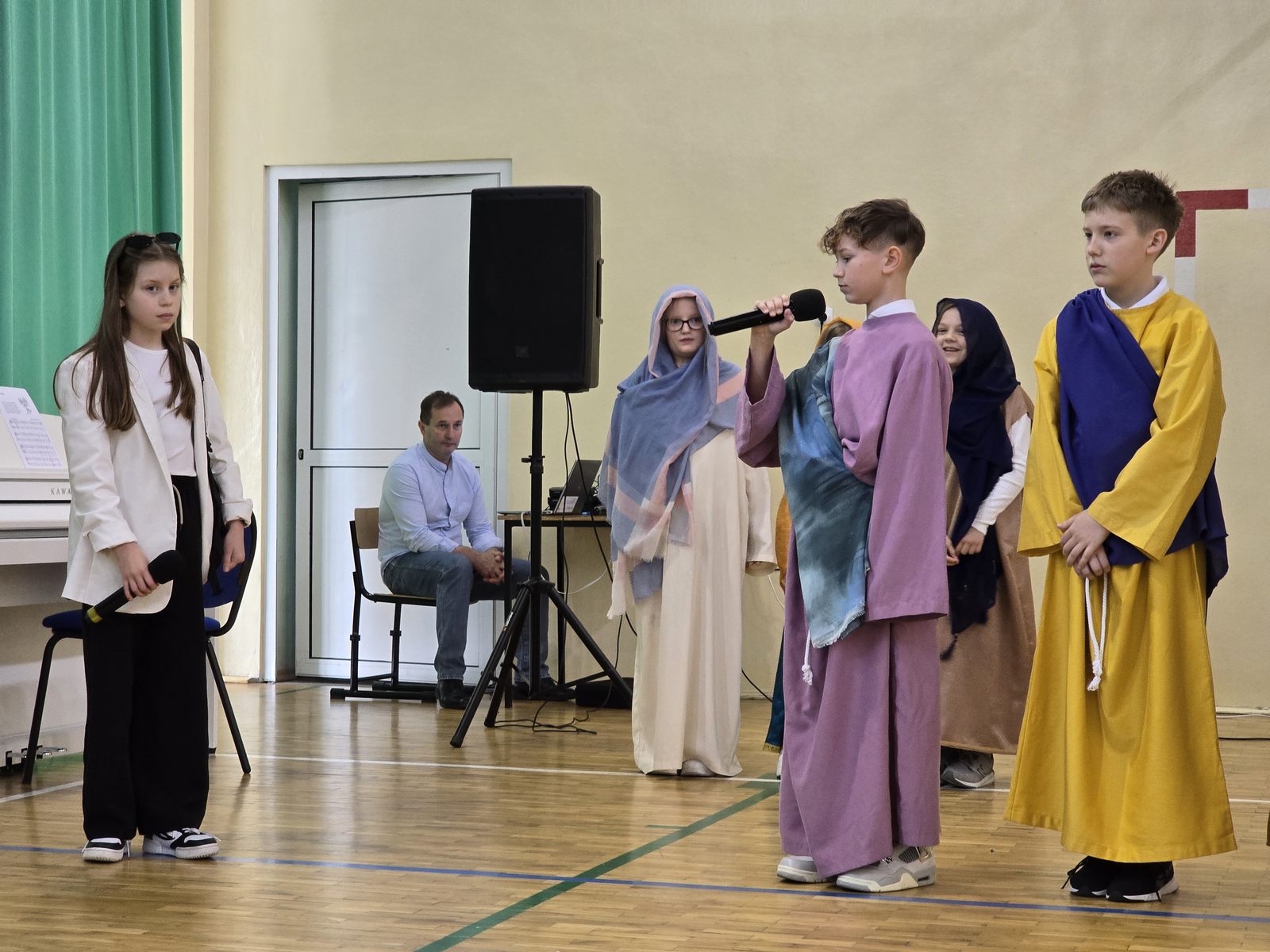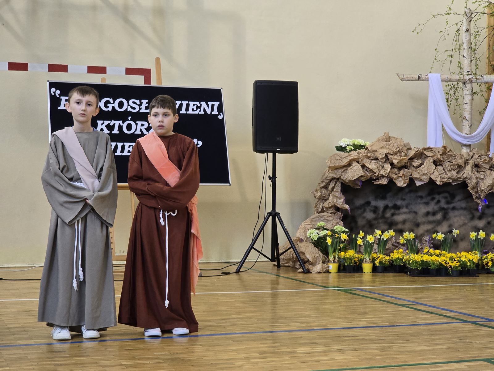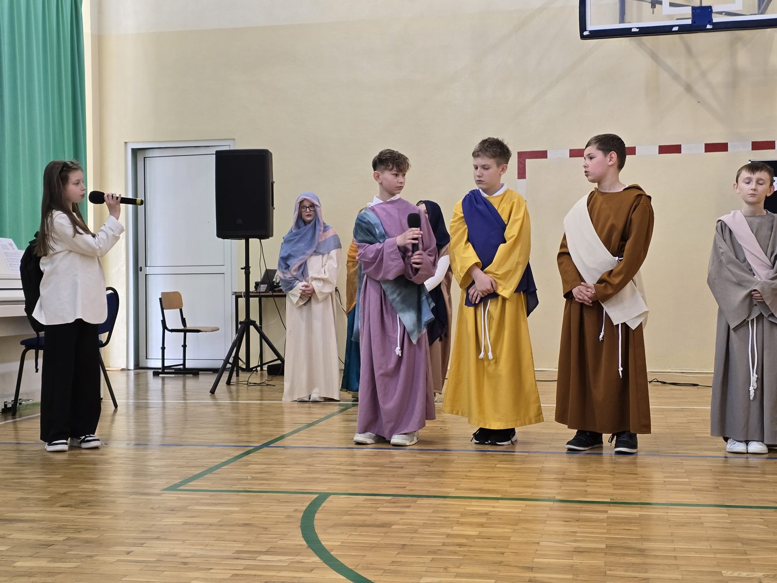 16 kwietnia 2025 r odbyła się w naszej szkole akademia z okazji nadchodzących Świąt Wielkanocnych. Uczniowie, nauczyciele oraz przedstawiciele rodziców zgromadzili się na sali gimnastycznej, aby wspólnie uczcić ten wyjątkowy czas refleksji, nadziei i odrodzenia. Uczniowie klasy IVa przygotowali program artystyczny pt. "Błogosławieni, którzy uwierzyli", który wprowadził zgromadzonych w świąteczny nastrój.