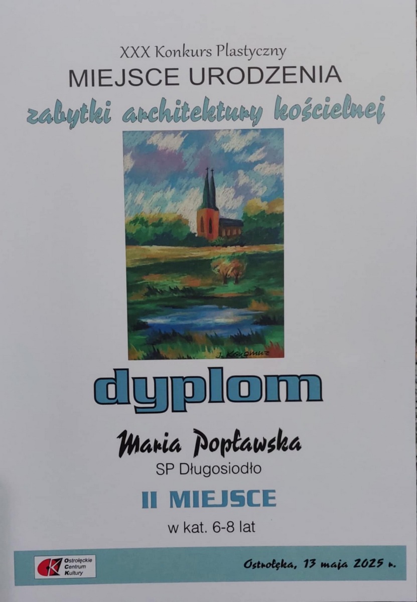 Z radością informujemy, że uczniowie naszej szkoły zostali laureatami XXX Konkursu Plastycznego pt. „Miejsce Urodzenia - Zabytki Architektury Kościelnej”, zorganizowanego przez Ostrołęckie Centrum Kultury.