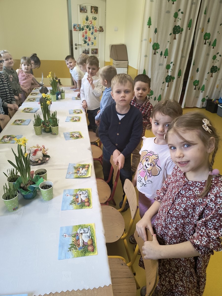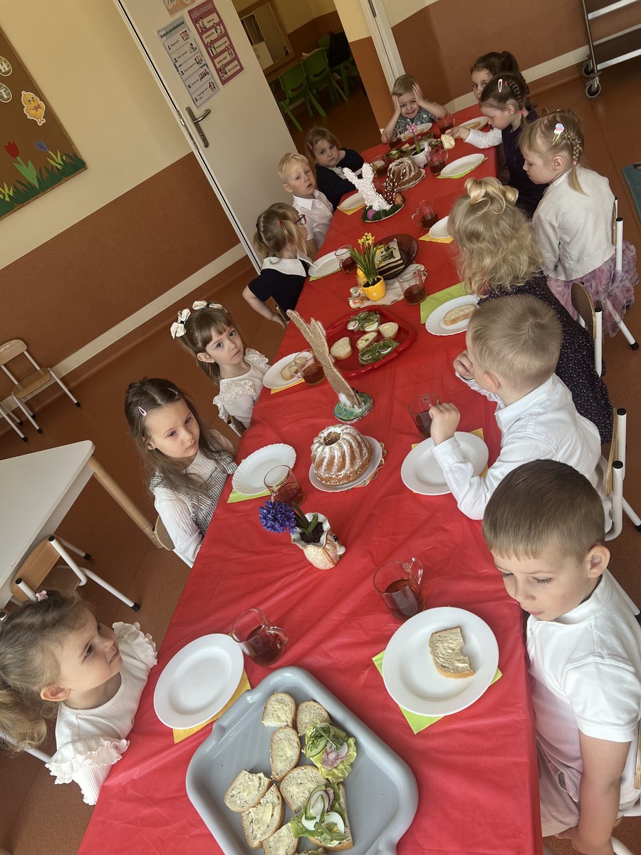 Wielkanoc to najstarsze i najważniejsze święto chrześcijańskie, mające bogatą tradycję i liczne religijne obrzędy. Jednym z nich jest uroczyste śniadanie, które poprzedza składanie sobie życzeń oraz dzielenie się jajkiem. Również w naszym przedszkolu ta tradycja jest kultywowana. 15 kwietnia, dzieci wraz z paniami zasiadły do śniadania wielkanocnego. Przedszkolaki aktywnie włączyły się w przygotowanie świątecznego stołu. Na stole pojawiły się tradycyjne wielkanocne przysmaki – jajka, babka, mazurek i kiełbaska. Nie zabrakło także symboli wielkanocnych oraz pięknych stroików z bazi i bukszpanu oznaczających przyrodę, która budzi się do życia. Podczas spotkania przedszkolaki śpiewały piosenki związane z tematyką wiosenno-świąteczną. Wspólne, uroczyste śniadanie wywołało miłe i niezapomniane doznania, które na długo pozostaną w pamięci wszystkich wychowanków.