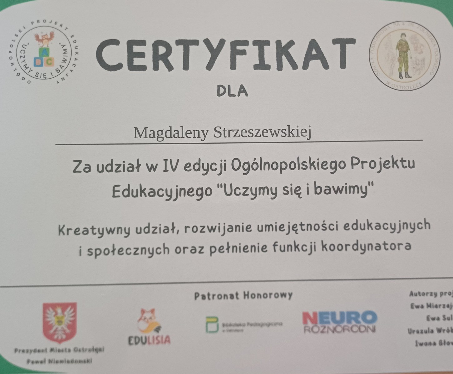 Uprzejmie informujemy, że nasza szkoła otrzymała certyfikat udziału w IV edycji Ogólnopolskiego Projektu Edukacyjnego „Uczymy się i bawimy". Jego głównym celem jest innowacyjne i kreatywne podejście nauczycieli do rozwijania podstawowych umiejętności edukacyjnych i społecznych u dzieci ze specjalnymi potrzebami edukacyjnymi. Uczniowie wykonywali zadania z projektu na zajęciach rewalidacyjnych.