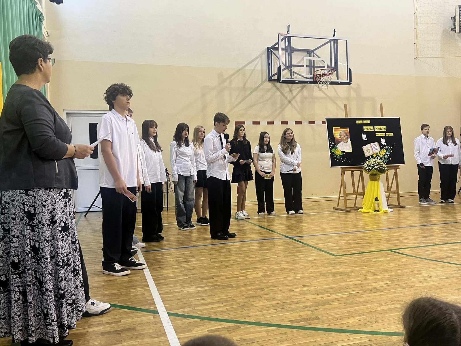 Pod hasłem „Św. Jan Paweł II. Prorok Nadziei” uczniowie klasy VIIIb i VIIIa w dniu 16 października zaprezentowali montaż słowno – muzyczny z okazji XXV Dnia Papieskiego pod kierunkiem s. Hanny Ropiak, w którym przypomnieli wszystkim, że w świecie pełnym lęku i beznadziei, przesłanie św. Jana Pawła II wciąż podtrzymuje na duchu i wskazuje właściwe drogi wyboru. Spotkanie rozpoczęliśmy wspólnym odśpiewaniem „Barki”, a w dalszej części było okazją do refleksji nad życiem i nauczaniem Jana Pawła II, zwłaszcza jego rolą jako głosiciela nadziei w trudnych czasach. Na zakończenie delegacja uczniów kl. VIIIb złożyła kwiaty i zapaliła znicz na pomniku św. Jana Pawła II.