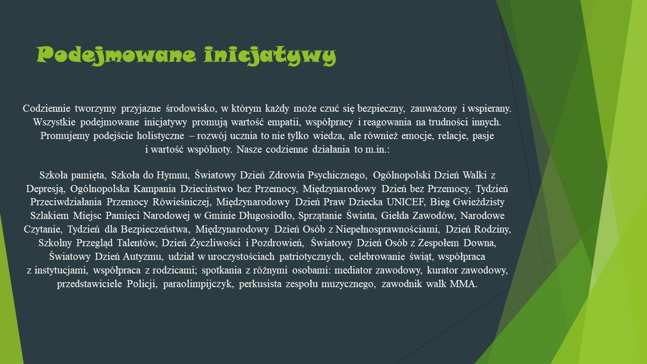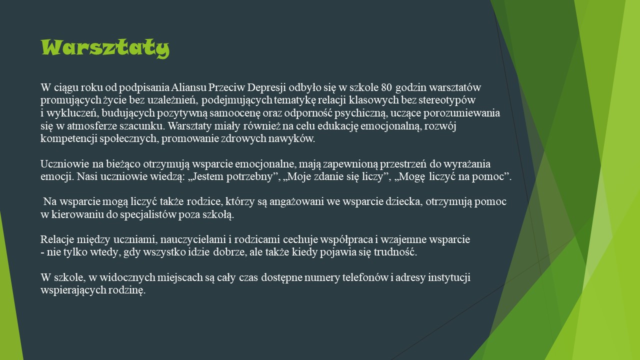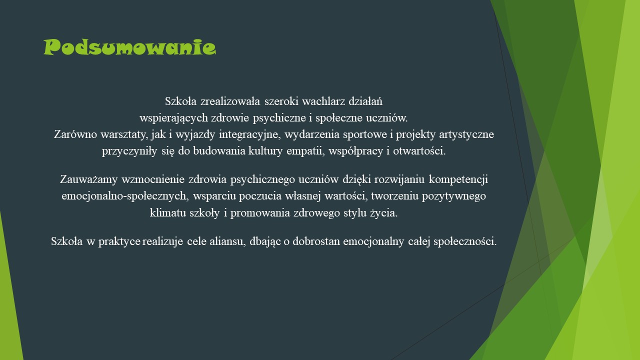 W dniu 3 grudnia 2025 r. w Wyszkowie odbyło się spotkanie podsumowujące działania w ramach aliansu przeciw depresji. Nasza szkoła aktywnie realizowała przez cały rok różne działania w tym zakresie. Działania obejmowały zarówno warsztaty profilaktyczne, zajęcia integracyjne, projekty artystyczne, kampanie informacyjne, jak również wycieczki i zawody sportowe. Wszystkie wydarzenia były ukierunkowane na rozwój umiejętności społecznych i przeciwdziałanie izolacji. Działania te podsumowuje poniższa prezentacja.