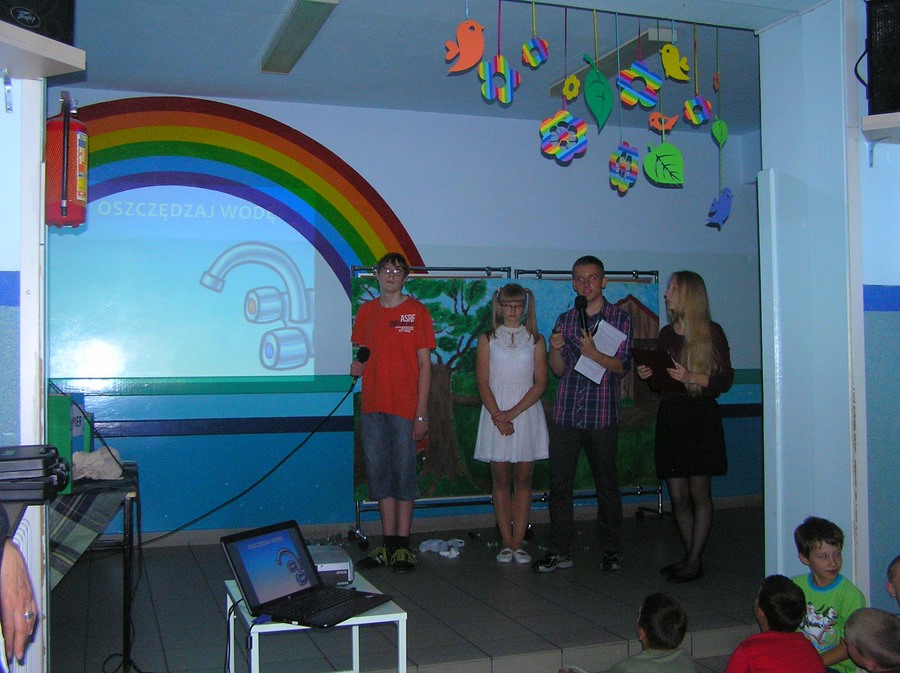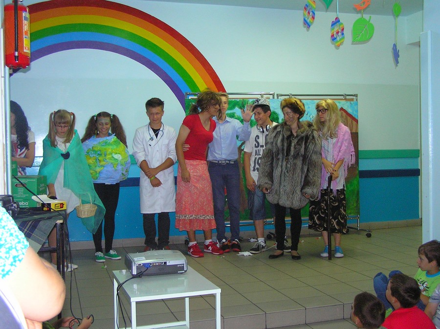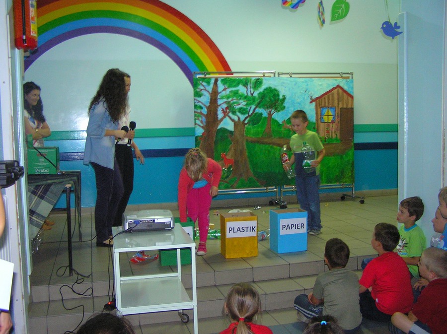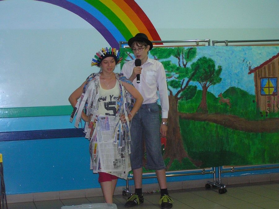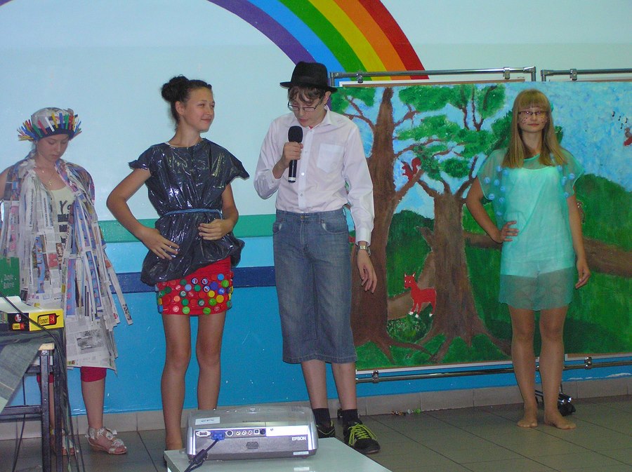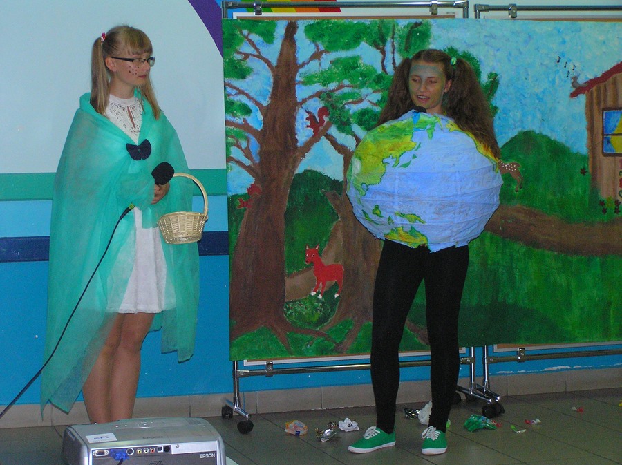 Podczas oglądania prezentacji multimedialnej i przedstawienia w języku angielskim „Little Green Riding Hood” uczniowie zgłębiali wiedzę na temat oszczędnego gospodarowania wodą, energią i dysponowania odpadami naturalnymi. Zielony Kapturek, wilk i niedźwiedź wraz z rozbawioną grupą dzieciaków segregowali śmieci do odpowiednich pojemników i brali udział w dyskusjach na temat ważnej roli roślin w oczyszczaniu powietrza z zanieczyszczeń.