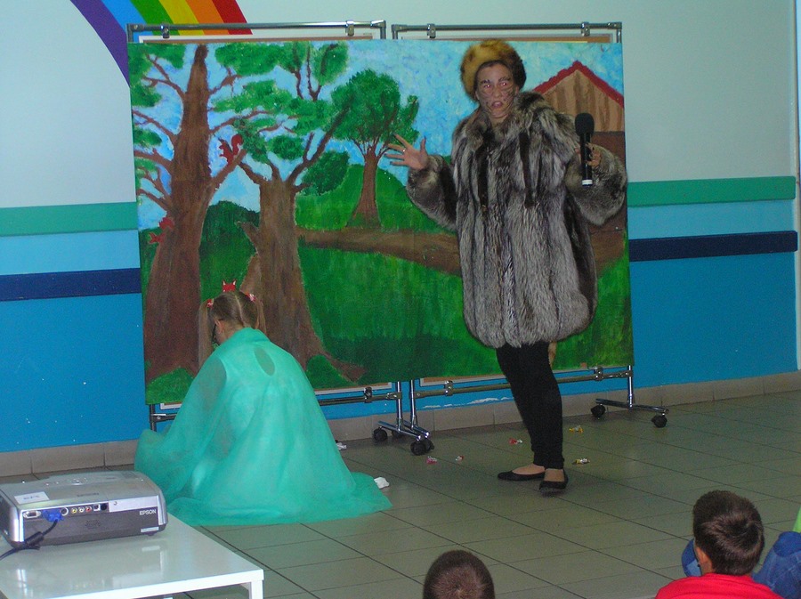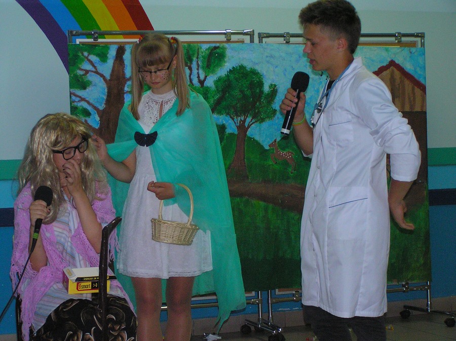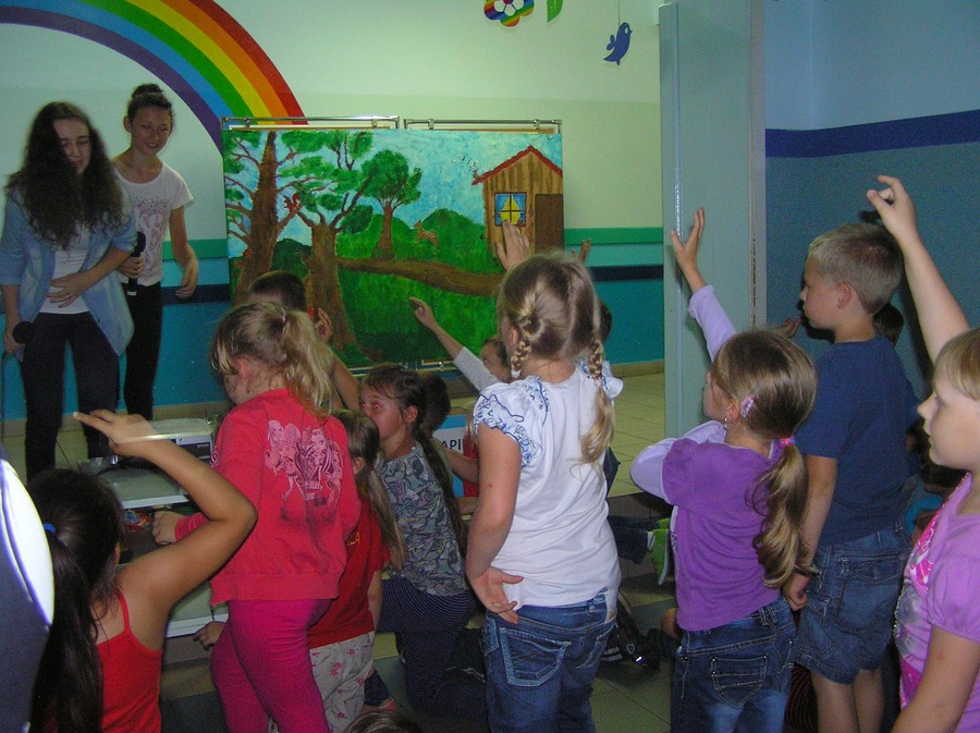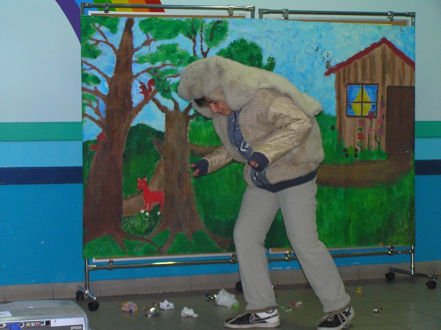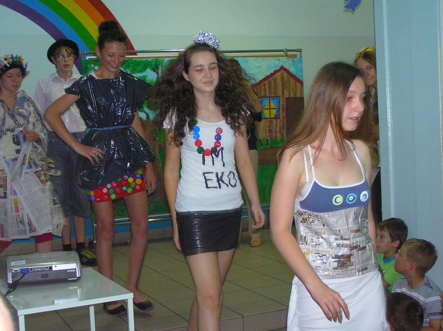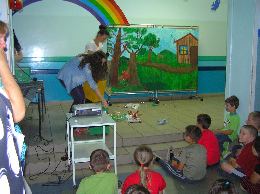 Podczas oglądania prezentacji multimedialnej i przedstawienia w języku angielskim „Little Green Riding Hood” uczniowie zgłębiali wiedzę na temat oszczędnego gospodarowania wodą, energią i dysponowania odpadami naturalnymi. Zielony Kapturek, wilk i niedźwiedź wraz z rozbawioną grupą dzieciaków segregowali śmieci do odpowiednich pojemników i brali udział w dyskusjach na temat ważnej roli roślin w oczyszczaniu powietrza z zanieczyszczeń.