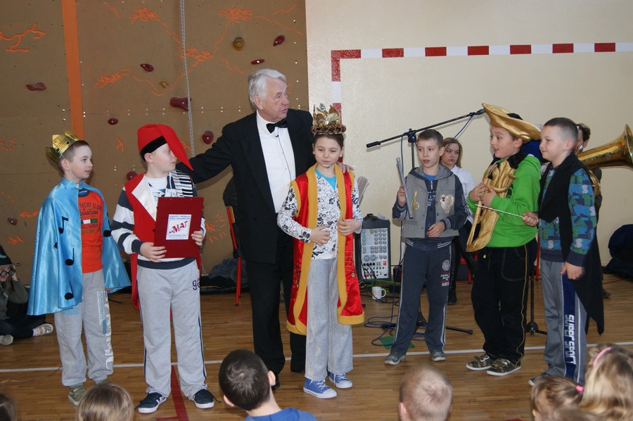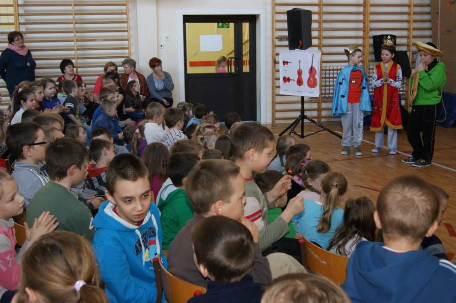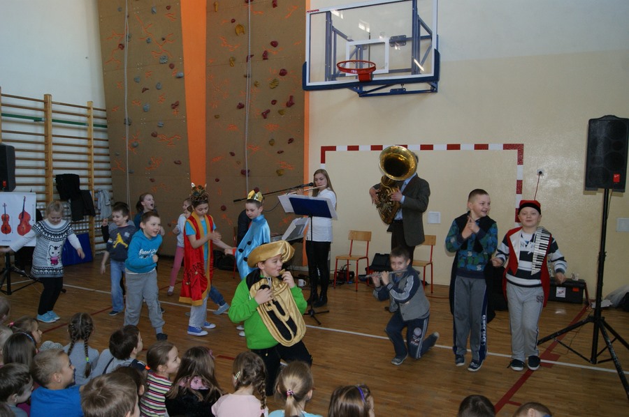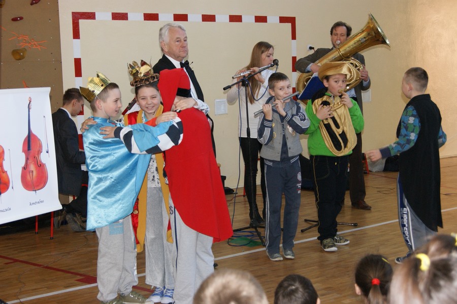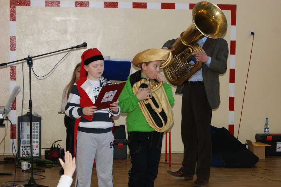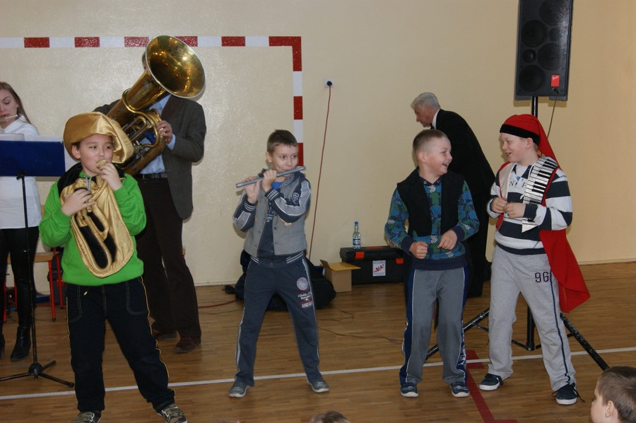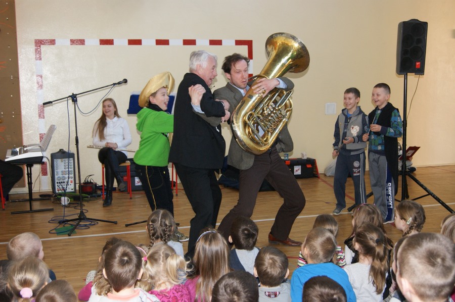 2 kwietnia 2014r. odbyło się kolejne spotkanie z Panią Muzyką pt. "Dwa Michały pięknie grały", prowadzone przez profesjonalnych muzyków z Agencji Artystycznej MAT z Olsztyna. W muzycznej opowieści instrumentami wiodącymi były flet poprzeczny i tuba. Uczniowie i przedszkolaki poznały ich brzmienie i budowę. Głównymi bohaterami inscenizacji muzycznej byli dwaj bracia: Michał Duży i Michał Mały, którzy przybyli na królewski dwór by zaprezentować przed królem i królową swój muzyczny talent. Plany ich pokrzyżowała zła czarownica Izydora chowając instrument Michała. Na szczęście naszym bohaterom udało się odzyskać flet i stworzyli wspaniałą orkiestrę. Interesująca, wesoła fabuła, barwne stroje, dźwięki walca i polki umiliły wspólnie spędzony czas. Na koniec spotkania odbył się konkurs z nagrodami, podsumowujący zdobyte wiadomości.