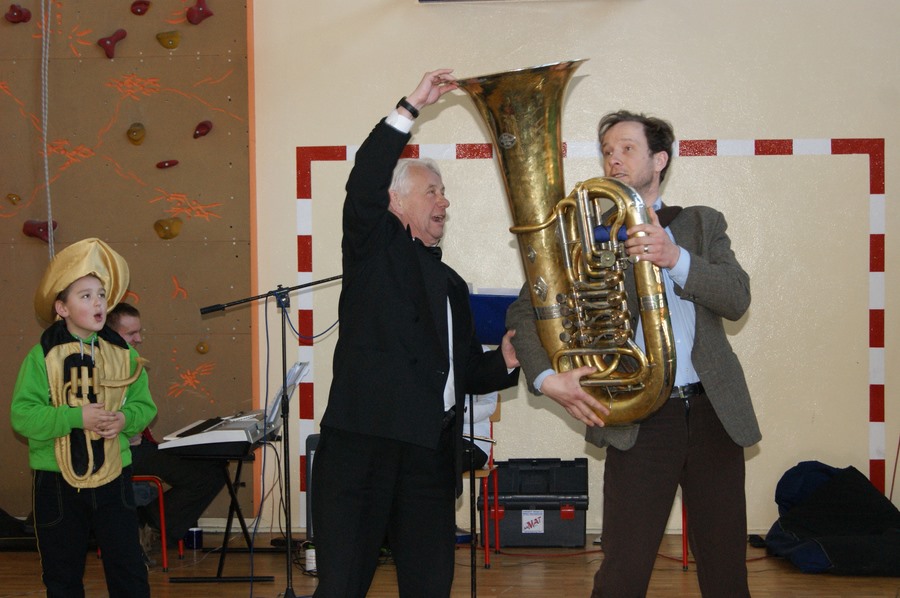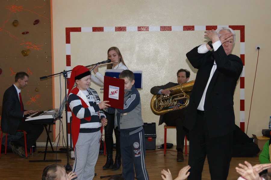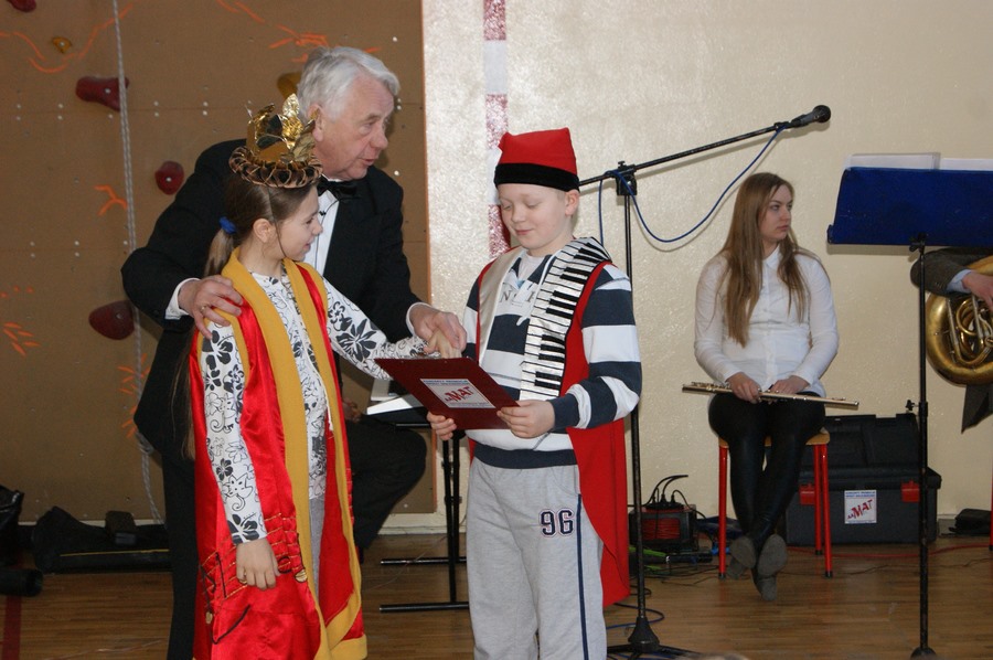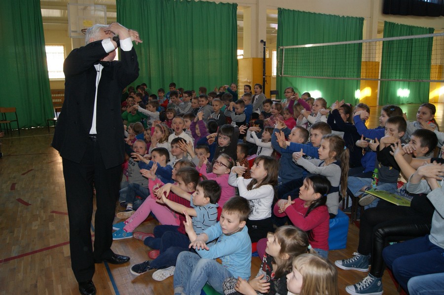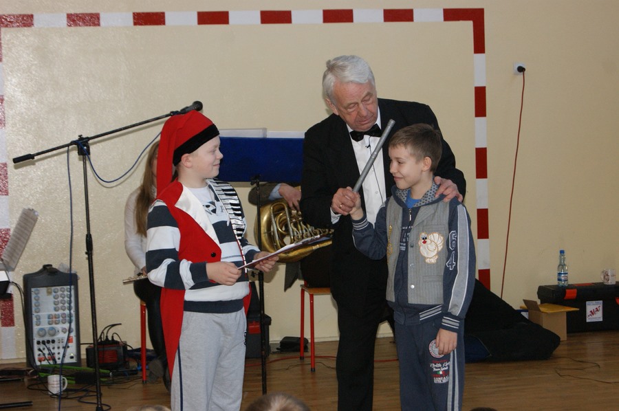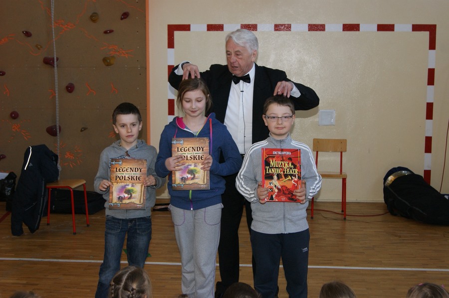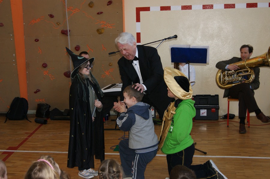 2 kwietnia 2014r. odbyło się kolejne spotkanie z Panią Muzyką pt. "Dwa Michały pięknie grały", prowadzone przez profesjonalnych muzyków z Agencji Artystycznej MAT z Olsztyna. W muzycznej opowieści instrumentami wiodącymi były flet poprzeczny i tuba. Uczniowie i przedszkolaki poznały ich brzmienie i budowę. Głównymi bohaterami inscenizacji muzycznej byli dwaj bracia: Michał Duży i Michał Mały, którzy przybyli na królewski dwór by zaprezentować przed królem i królową swój muzyczny talent. Plany ich pokrzyżowała zła czarownica Izydora chowając instrument Michała. Na szczęście naszym bohaterom udało się odzyskać flet i stworzyli wspaniałą orkiestrę. Interesująca, wesoła fabuła, barwne stroje, dźwięki walca i polki umiliły wspólnie spędzony czas. Na koniec spotkania odbył się konkurs z nagrodami, podsumowujący zdobyte wiadomości.
